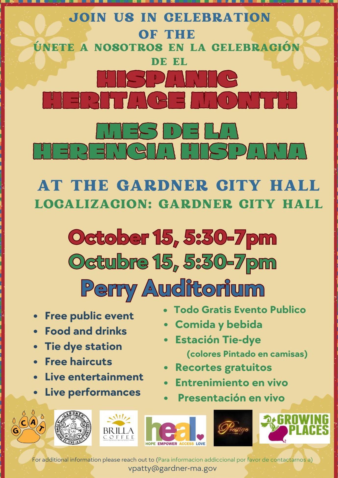The Hispanic Heritage month event at Gardner City Hall is Wednesday, October 15, 2025 from 5:30 to 7pm.It’s a free public event put on by the Gardner Community Action Team and features food and drinks, a tie dye station, free haircuts, live entertainment, and live performances.