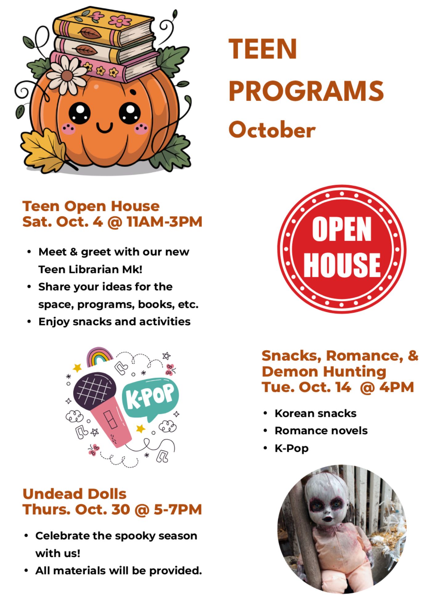 The library is having a teen open house on Saturday October 4th from 11am to 3pm. A Meet and greet with the new teen librarian is included. Teens can share ideas for the space, programs, books, and more and enjoy snacks and activities. Other activities coming up include Tuesday, October 14th at 4pm: Korean snacks, romance novels, and K-Pop, and, Undead Dolls Thursday October 30th from 5-7pm to celebrate the spooky season.