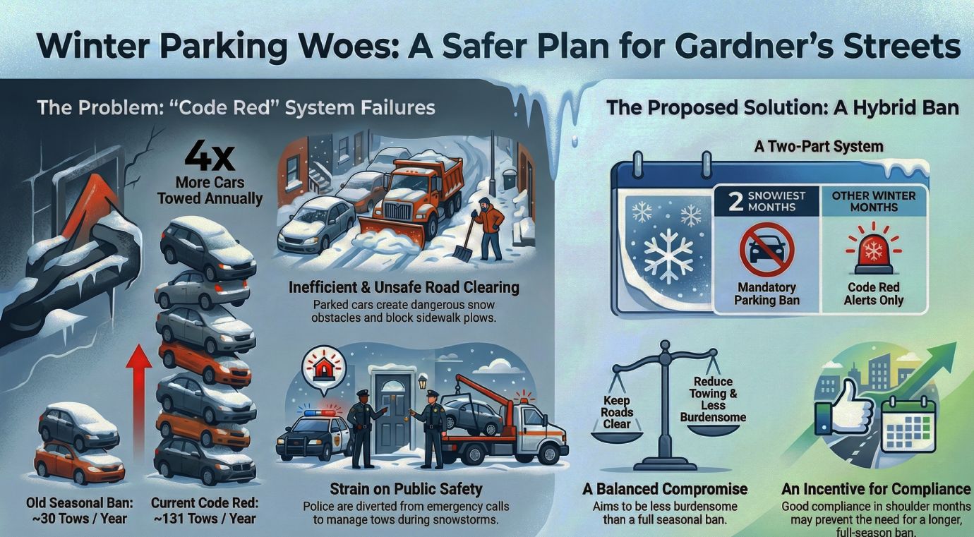 The Gardner Public Safety Committee primarily focused on a public hearing to discuss amendments to the city’s winter parking ban procedures. City officials were reviewing the ineffectiveness of the current Code Red alert system, which resulted in an overwhelming number of parked vehicles, causing operational inefficiencies and safety concerns for public works crews. The Director of Public Works provided data showing that the current alert method led to significantly higher towing rates and increased costs for the city and residents compared to the previous seasonal ban that cleared streets quickly. Testimony from the Police Chief and Deputy Chief supported implementing a hybrid model, which would codify a mandatory ban during the snowiest months to ease the heavy burden placed on first responders who must spend time locating vehicle owners during storms. After discussion, the committee members agreed that the new approach was a necessary compromise and voted to recommend the proposed ordinance be sent for initial approval by the full council. In the subsequent City Council meeting held that evening, the hybrid plan was approved. See City Council meeting article for details.