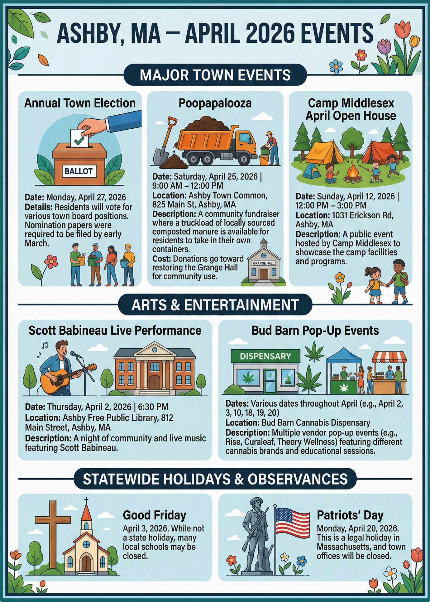In April 2026, Ashby, MA, will host several community-focused events, including the Annual Town Election, a unique Poopapalooza fundraiser, and local musical performances.