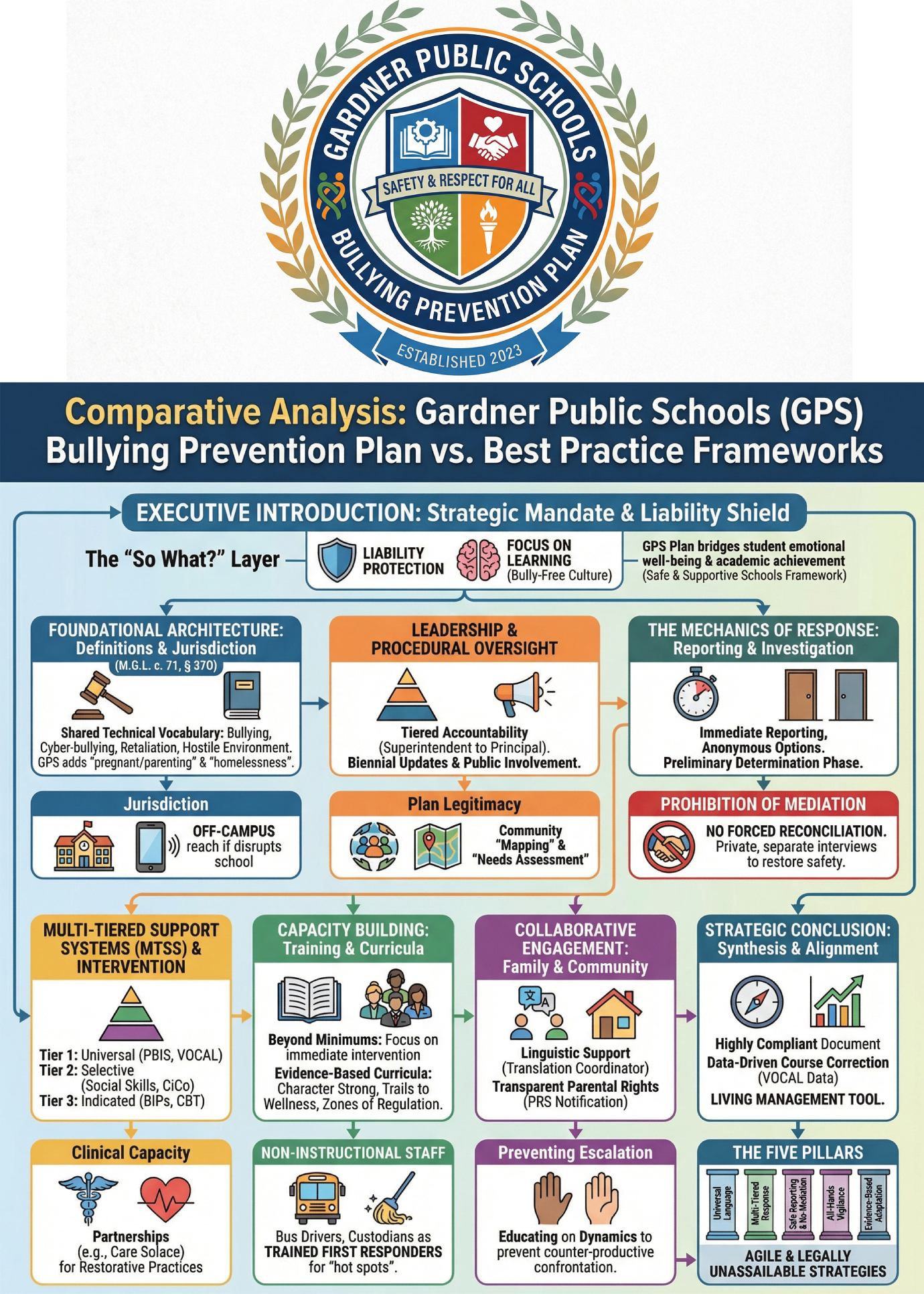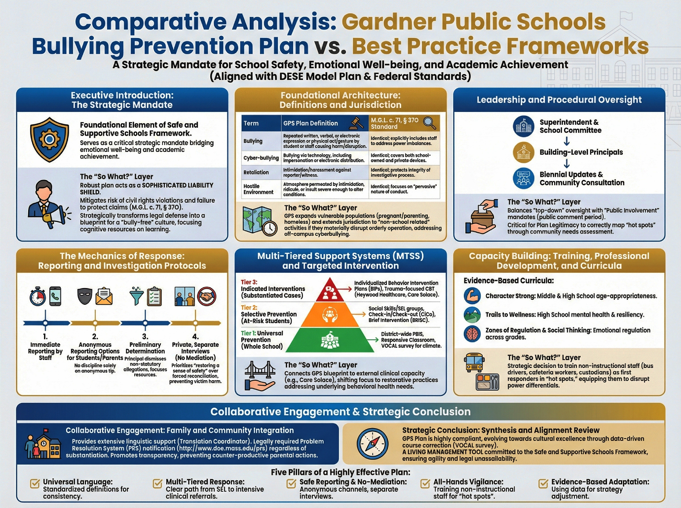 The “So What?” Layer From a leadership perspective, a robust plan functions as a sophisticated liability shield. By adhering strictly to M.G.L. c. 71, § 37O, the district mitigates the risk of “civil rights violations” and “failure to protect” claims. Strategically, the plan transforms from a legal defense into a blueprint for a “bully-free” culture, ensuring that cognitive resources remain focused on learning rather than survival.