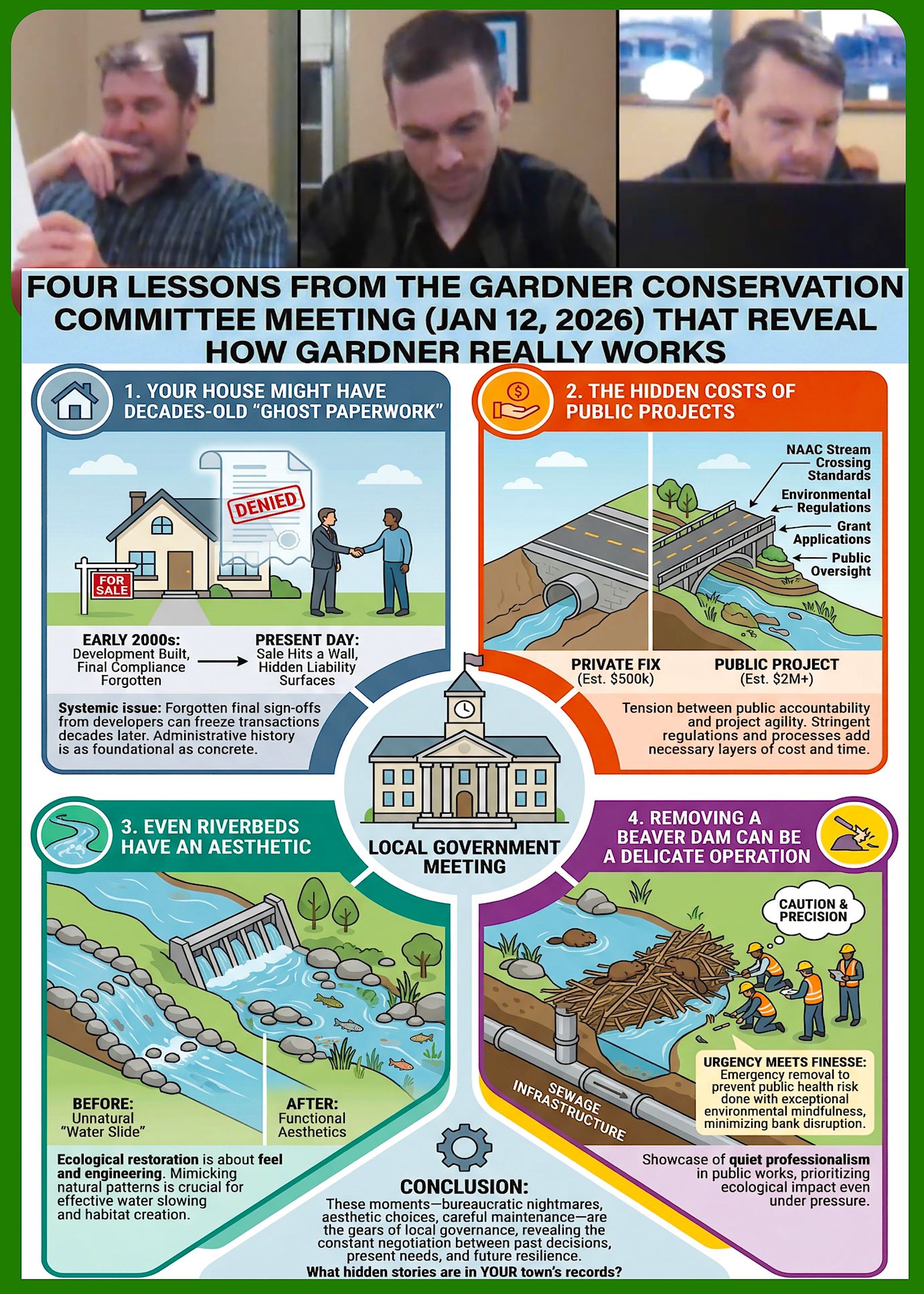 The Gardner Conservation Commission met on January 12, 2026 and members addressed various local environmental and land-use issues. The board begins by approving certificates of compliance for residential properties, resolving long-standing title issues caused by developer oversights. A significant portion of the session focuses on a proposed construction project on Green Street, where the commission reviews updated drainage calculations and grants an order of conditions. Additional updates are provided regarding a state grant for renovating a local playground and potential maintenance work on a collapsed culvert. The meeting concludes with the re-election of the chairperson Greg Dumas and a report from Conservation Agent Justin Enright concerning beaver dam removals, professional development, and upcoming environmental conferences. Listen to the entire meeting on any device, CLICK PLAY.Conservation 1-12-26