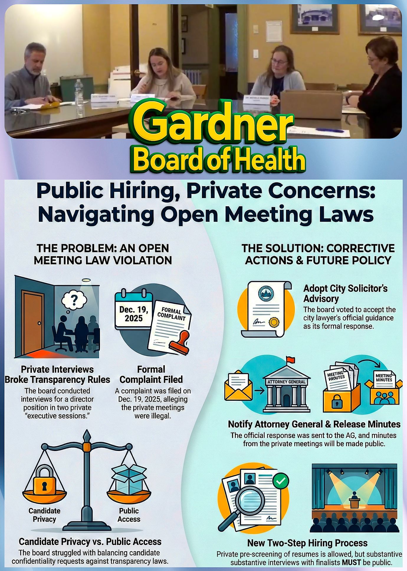 The Gardner Board of Health met on January 8, 2026, primarily to address a formal Open Meeting Law complaint. The board discussed an advisory from the city solicitor regarding executive sessions used for health director interviews, which were allegedly conducted in private improperly. Members expressed confusion over the legal distinction between private pre-screening and public interviews, noting the difficulty of balancing candidate confidentiality with transparency requirements. Ultimately, the board voted to adopt the city solicitor’s recommendations, which include releasing meeting minutes and filing a formal response with the Attorney General. The session concluded with a commitment to refine their hiring processes once legal counsel returns from vacation to clarify specific statutory language. Listen to the entire meeting on any device, CLICK PLAY.