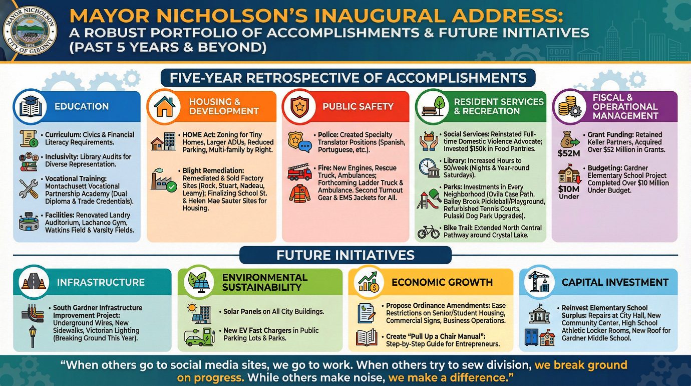 Overall, the Gardner Inauguration Ceremony on January 8, 2026 projected a vision of a city focused on pragmatic problem-solving, strategic investment, and regional leadership. Speakers consistently praised Gardner’s momentum, attributing its success to a results-oriented approach that prioritizes progress over political division.FULL COVERAGE: – Gardner MA 2026 Inauguration