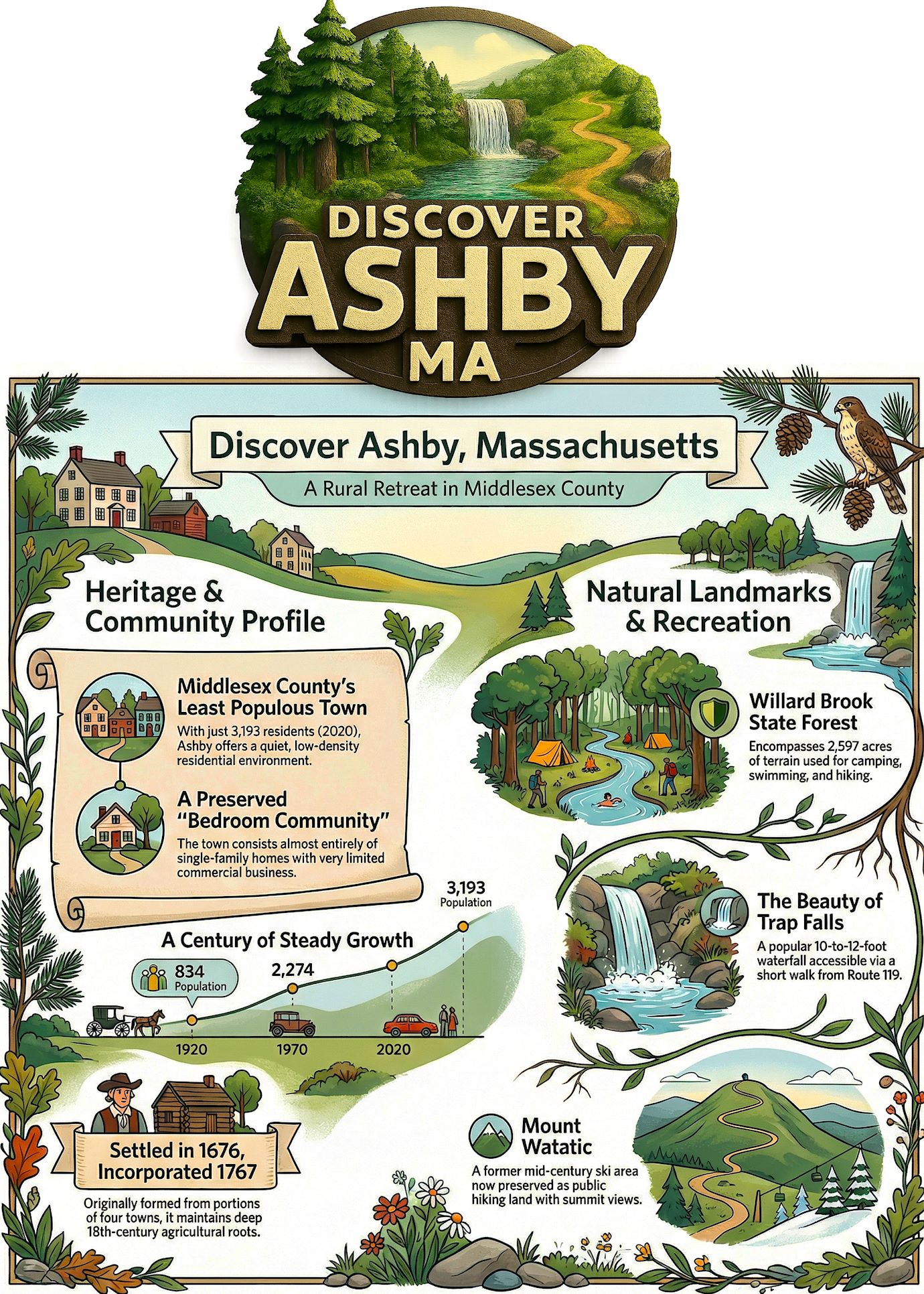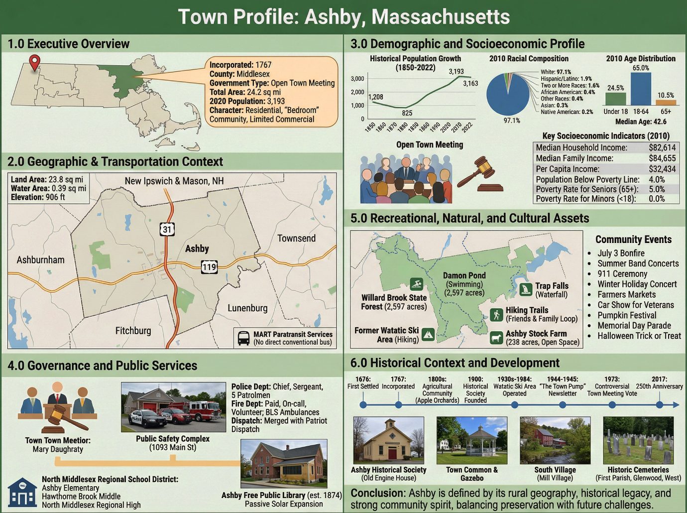Ashby, Massachusetts, is a town located in the northwestern corner of Middlesex County, defined by its fundamental identity as a residential or “bedroom” community. Characterized by single-family homes and a limited commercial presence, Ashby is the least populous municipality in the county, with a population of 3,193 according to the 2020 U.S. Census. The following data provides a high-level snapshot of the town’s core attributes for strategic consideration.
