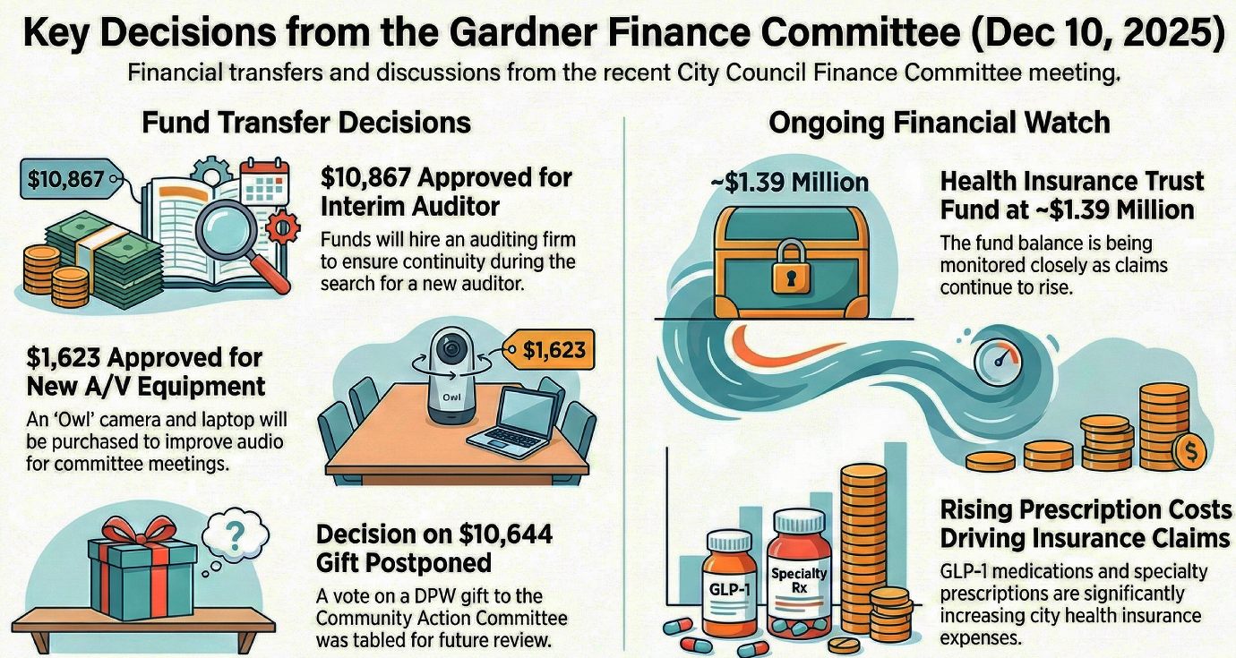The Gardner City Council Finance Committee meeting held on December 10, 2025 concerned a vote to approve a transfer of funds to contract with an auditing firm, CLA, to act as an interim city auditor following the departure of Auditor John Richard. Additionally, the committee considered confirming a large gift from the Department of Public Works (DPW) to the Gardner Community Action Committee, derived from collected scrap metal, while acknowledging that the proper disposal procedure had not been followed initially. Another item addressed was a transfer of funds to purchase a dedicated “owl” camera and laptop for recording City Council standing committee meetings to improve audio quality. Finally, the meeting included an update on the city’s health insurance payments and trust fund, noting that claims are currently higher than deposits, driven partly by GLP-1 prescriptions and elective surgeries. Listen to the entire meeting on any device, CLICK PLAY.