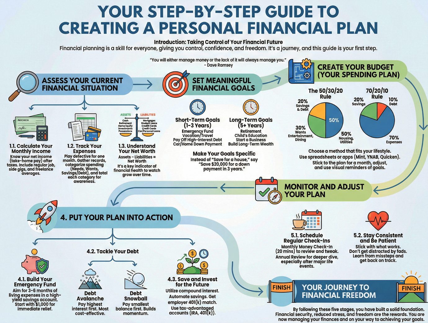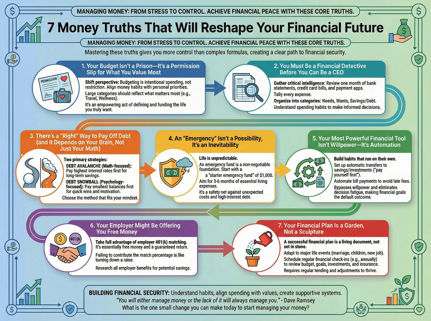 Building financial security is not about some hidden secret; itโs about getting a grip on your habits and making a plan you can stick to. It requires understanding where your money goes, aligning your spending with your values, and creating systems that support your long-term goals. As financial expert Dave Ramsey says, it comes down to a simple choice: