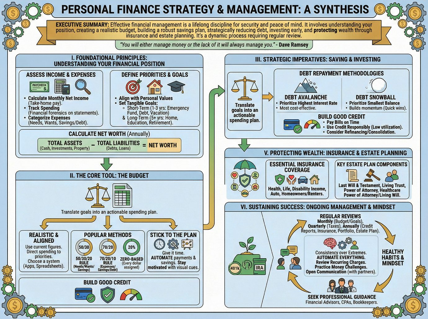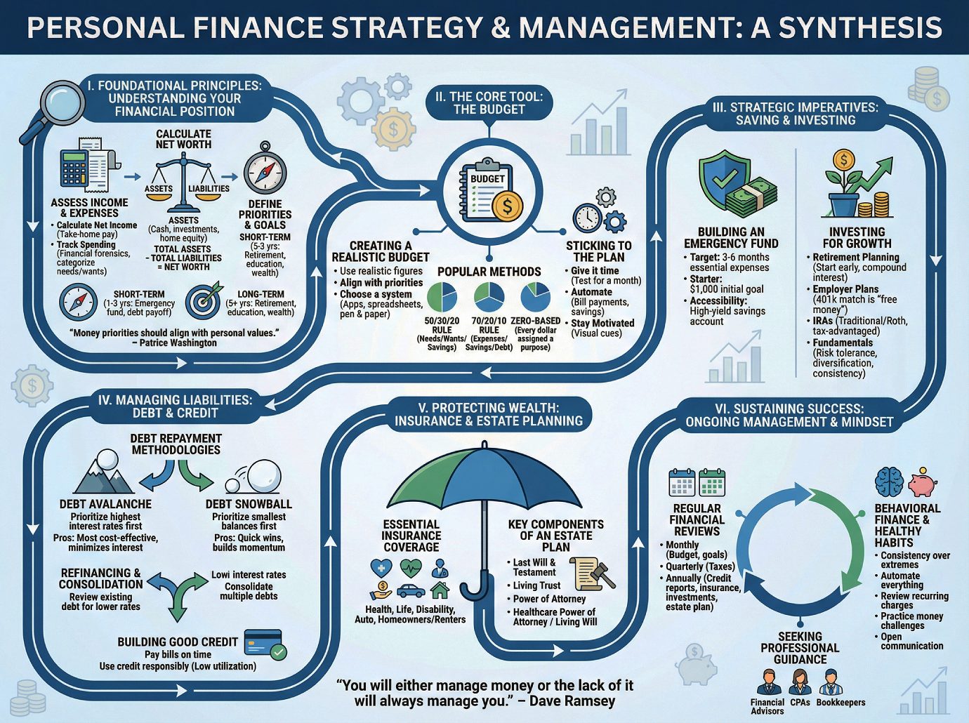 For long-term wealth creation, early and consistent investment is paramount, particularly through tax-advantaged retirement vehicles like 401(k)s and IRAs, and capitalizing on employer matching programs. Finally, wealth must be protected through adequate insurance coverage and comprehensive estate planning. This entire process is dynamic; it requires regular reviews and adjustments to adapt to life events and evolving goals, ensuring sustained financial well-being. As financial expert Dave Ramsey states, โYou will either manage money or the lack of it will always manage you.โ