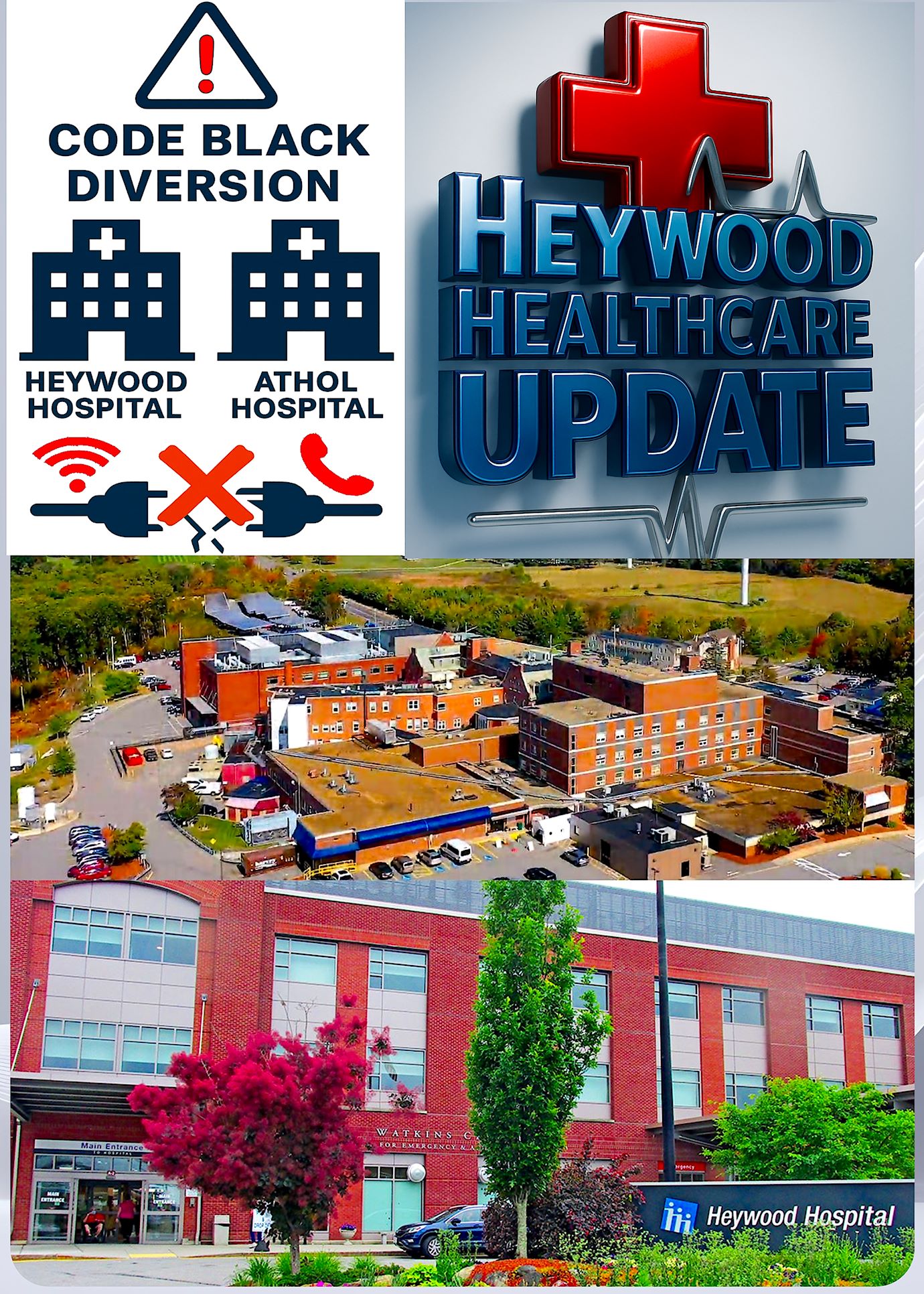 This was posted by Heywood Hospital just after 3pm on October 13, 2025: “Important Update: Heywood Hospital and Athol Hospital are currently on Code Black Diversion due to a network outage affecting phones and internet. Our teams are working diligently to resolve the issue and ensure that patient care remains our top priority. We appreciate the patience of our community and the dedication of our staff during this time.” Yesterday, Heywood Hospital also experienced a network issue which placed it on Code Black diversion for a period of time. According to Heywood, Athol Hospital remained operational throughout yesterday, but is affected today.