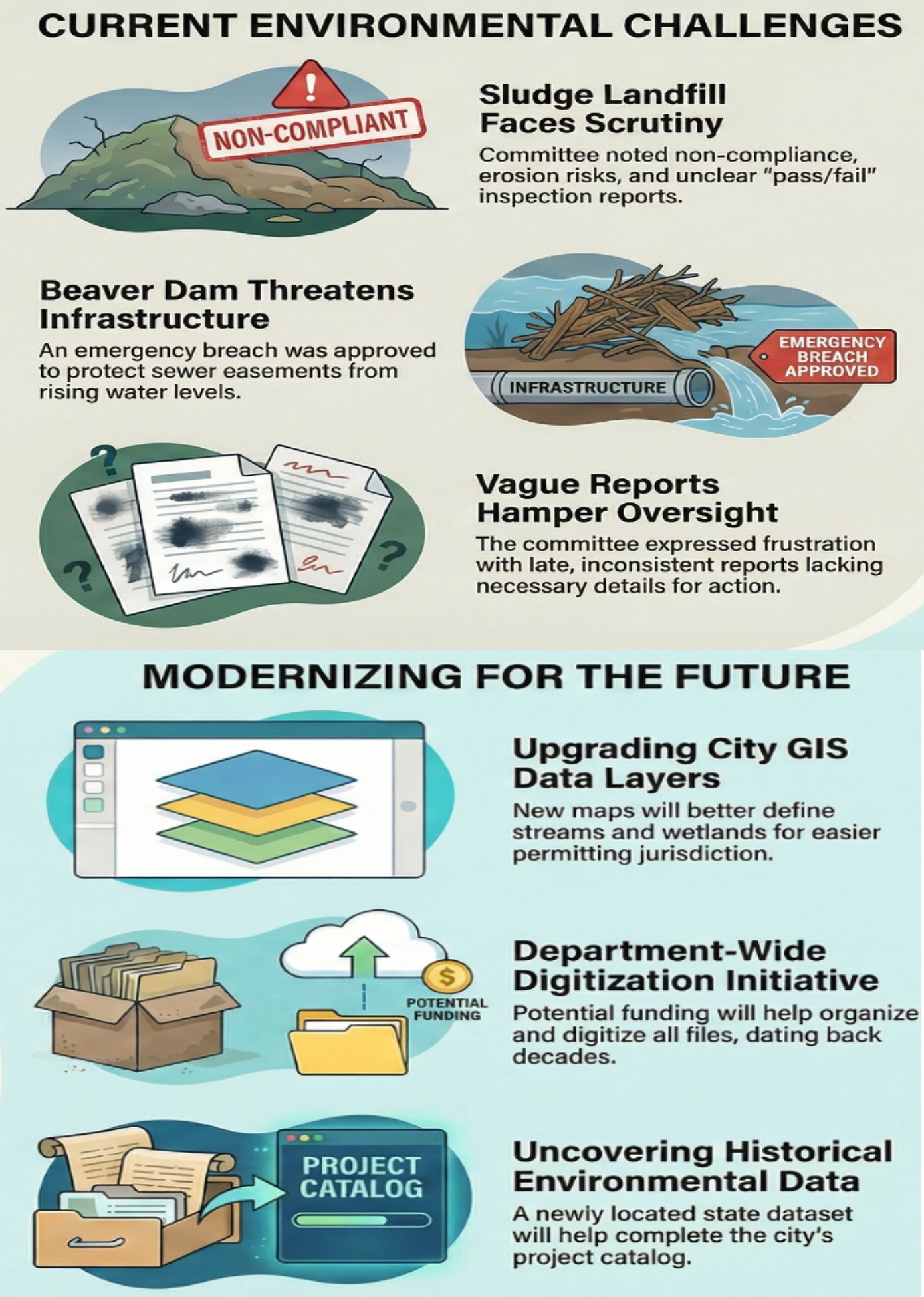 Discussions revolved around several environmental and administrative issues. Key points include a citizen’s request to keep an enforcement order open and continue monitoring the Gardner Sludge Landfill, citing concerns about*compliance, outdated plans, and erosion risk. The committee also addressed an emergency certification to breach a new **beaver dam near Mahoney Brook to protect infrastructure and prevent flooding. Additionally, the meeting covered concerns regarding inconsistent and untimely inspection reports for the landfill, the continuation of various project requests, updates on the Nature Trail and Kendall Pond treatments, and the agent’s progress in digitizing and organizing department records and updating GIS data layers for better conservation management.