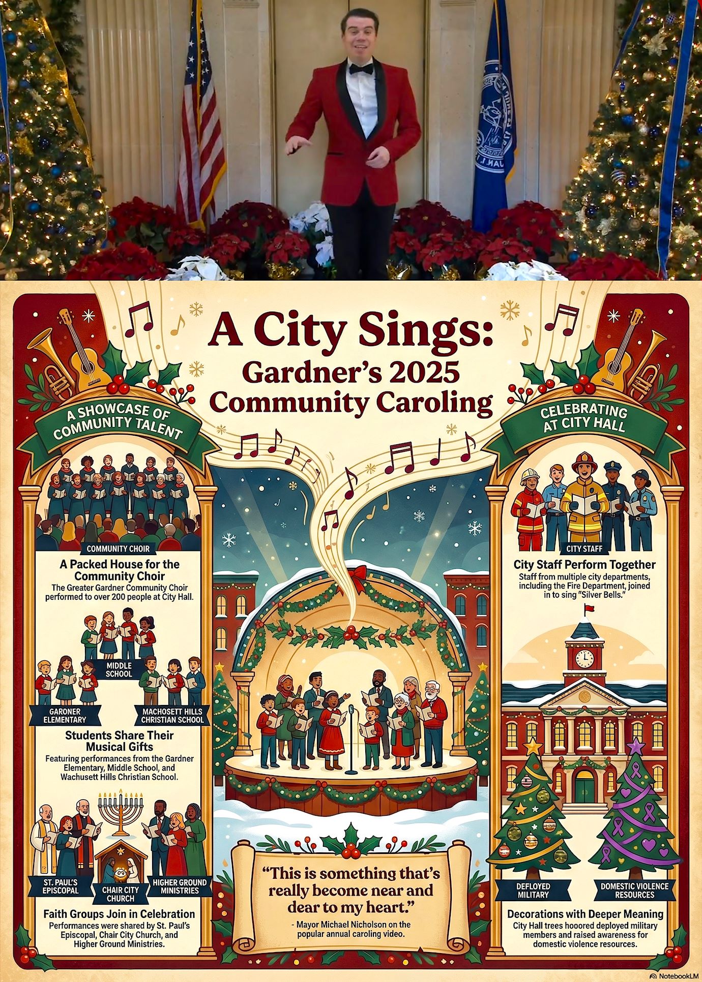 Caroling with the Mayor 2025 Or if you wish, play the video right out of this page so you can see all the performers. Greater Gardner Community Choir opens it up with a performance from Handelโs Messiah โUnto Us a Child Is Bornโ. Thereโs a diverse array of musical performances from local schools, church groups, and community choirs showcasing the cityโs artistic talent. Interspersed between the songs, the Mayor highlights various festive decorations within Gardner City Hall, including a tree honoring military members and entries from a departmental door-decorating contest. Mayor Michael Nicholson acknowledges the contributions of local organizations such as a task force dedicated to domestic violence awareness and prevention. The program concludes with a community-wide sing-along and a message of gratitude toward the citizens and staff who made the celebration possible. This annual program serves as a communal tribute to Gardnerโs spirit and local traditions during the Christmas week.
