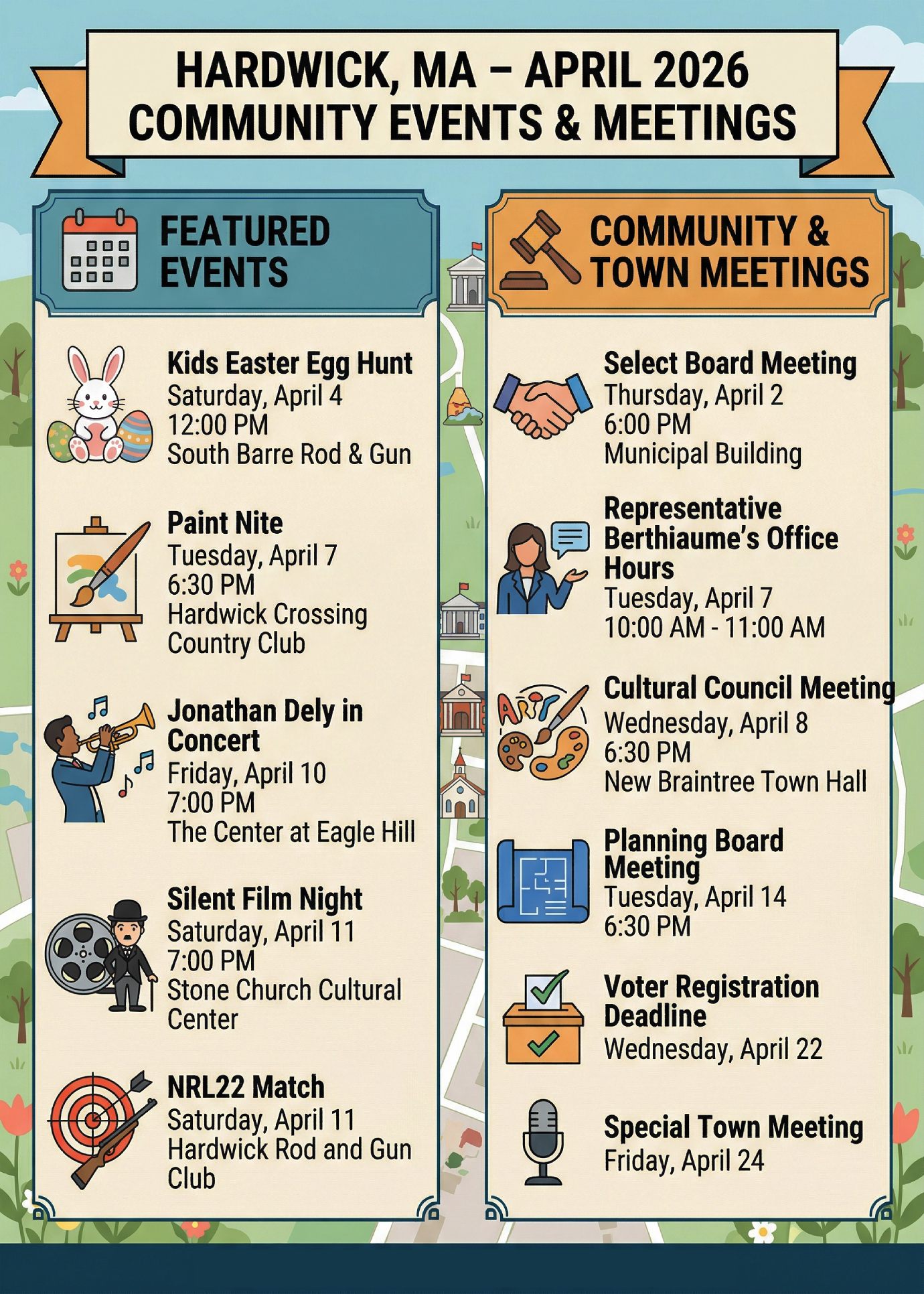 Key municipal dates for the month include: Select Board Meeting: Thursday, April 2 at 6:00 PM at the Myron E. Richardson Municipal Building. — Representative Berthiaume’s Office Hours: Tuesday, April 7 from 10:00 AM to 11:00 AM. Cultural Council Meeting: Wednesday, April 8 at 6:30 PM at the New Braintree Town Hall. — Planning Board Meeting: Tuesday, April 14 at 6:30 PM. — Voter Registration Deadline: Wednesday, April 22 is the last day to register to vote for the Annual Town Election. – Special Town Meeting: Friday, April 24.