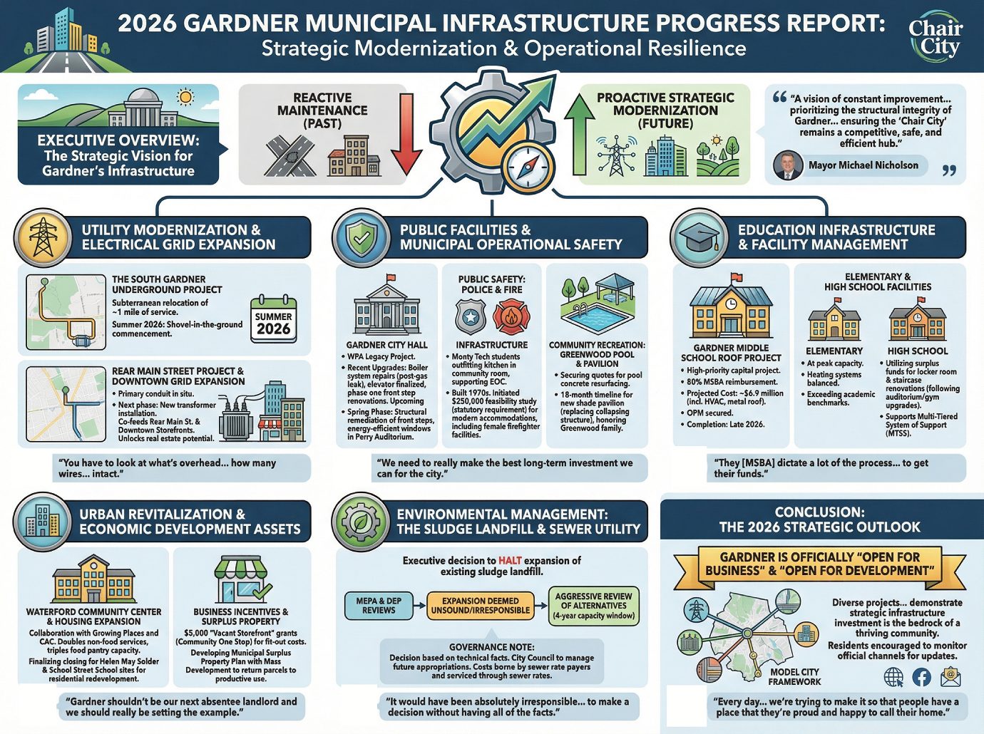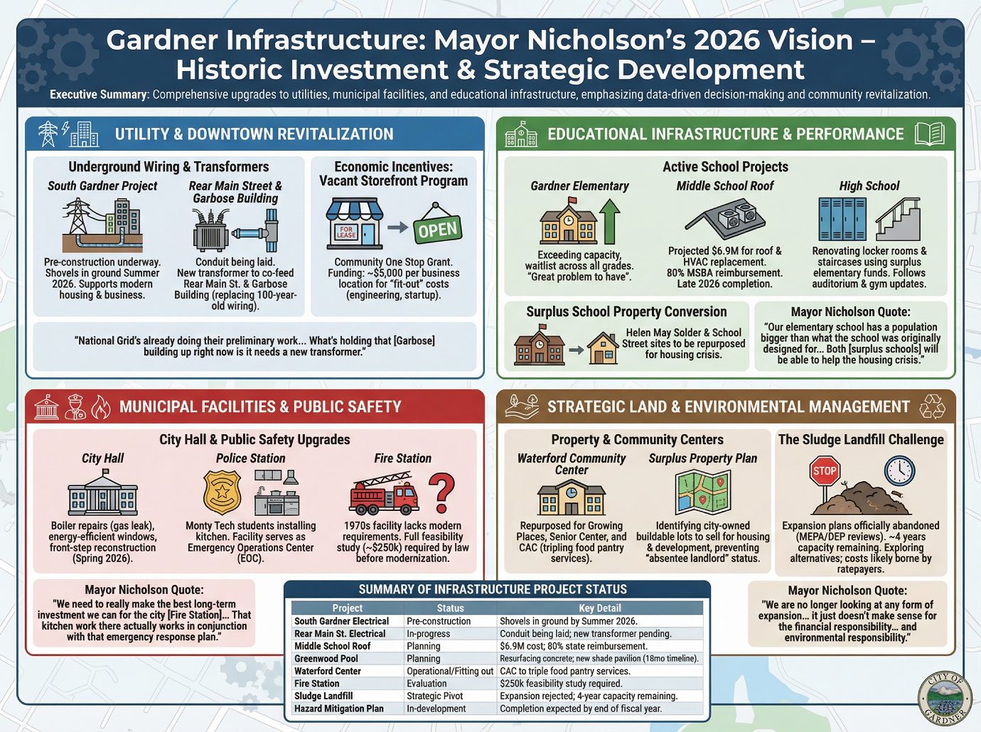This briefing document synthesizes the strategic infrastructure and community development initiatives for Gardner, Massachusetts, as outlined by Mayor Michael Nicholson in February 2026. The city is currently undergoing a period of historic investment characterized by comprehensive upgrades to utilities, municipal facilities, and educational infrastructure.