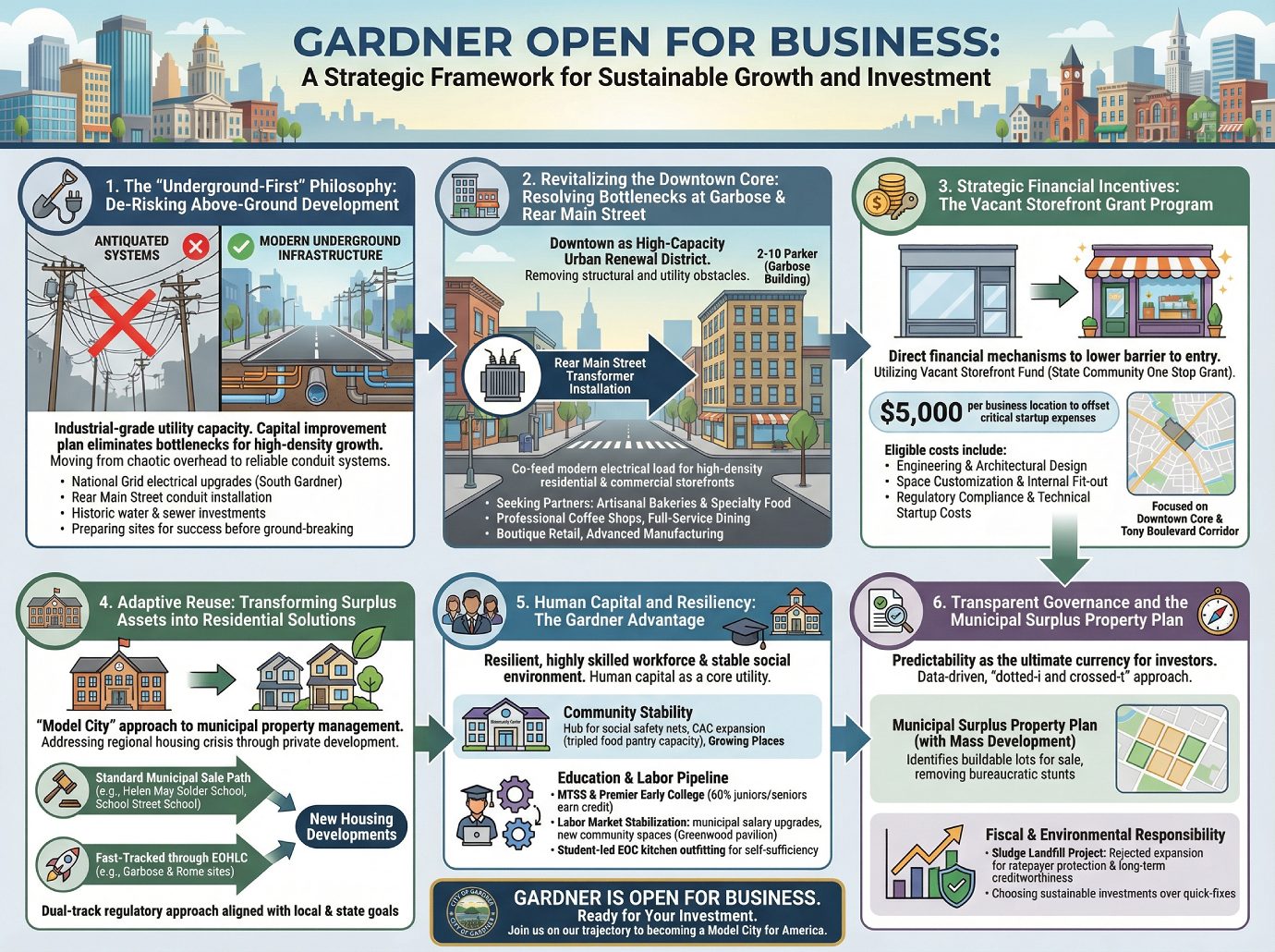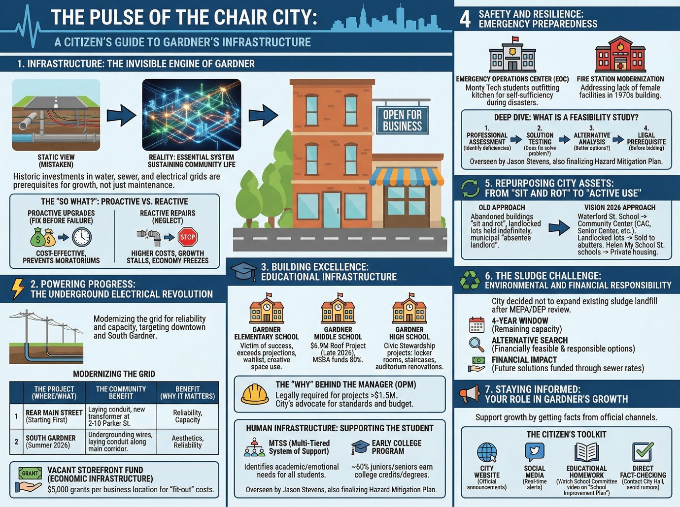 Key priorities include the transition to underground electrical systems in South Gardner and downtown, the revitalization of vacant storefronts through grant incentives, and the conversion of surplus municipal properties into housing. While the city celebrates successes in educationโspecifically the growth of the Gardner Elementary School and the โEarly Collegeโ programโit faces critical challenges regarding the modernization of the 1970s-era fire station and the finite capacity of the municipal sludge landfill. The administration maintains a policy of data-driven decision-making, emphasizing the completion of state-mandated reviews and feasibility studies before committing taxpayer funds to large-scale construction.