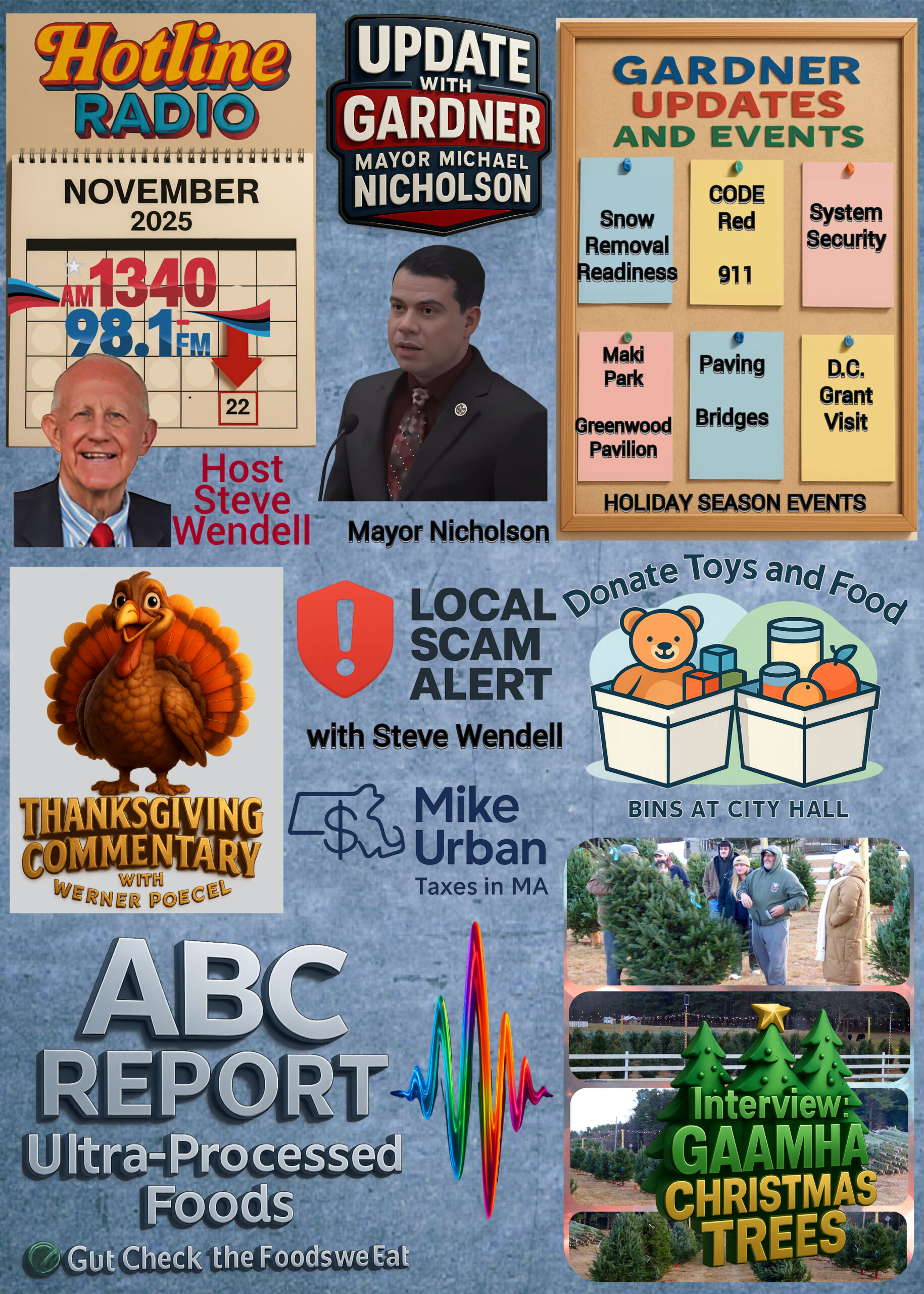 —– A Thanksgiving Commentary with Werner Poegel – Steve Wendell had a Commentary on what he called a scam by Kimberly Blake focusing on a current effort under something called the “Army of Angels” to collect items for an entity which Wendell states is not a non-profit. Wendell suggested donations to the Gardner CAC as a better alternative – ABC Report on Food Consumption including Ultra-Processed Foods – Gut Check the Foods we Eat – Mike Urban on Taxes in MA – Interview: —Steve Wendell speaks with GAAMHA CEO Shawn Hayden on Christmas Trees. Sales start on Black Friday, the Friday after Thanksgiving and the lot will be open 7 days a week. Santa Claus will be there on November 30th and people can sign up to have pictures with Santa.