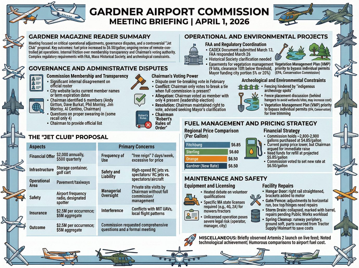 There is significant internal disagreement regarding the official roster of the Airport Commission with the Airport Manager noting that the City of Gardner website does not list current member names or term expiration dates. Questions were raised regarding whether all sitting members were properly sworn in, as some attendees recalled only 4 members being sworn in at a previous session. Some members also disputed a tie-breaking vote cast by Chair James Woods in February, indicating that the vote cast by Woods might have been illegal. Chair Woods suggested those contesting the result seek clarification from the Mayorโs office. Further contentious discussion ensued when Wood proposed adopting โRobertโs Rules of Orderโ to limit discussion times โ that motion was defeated.