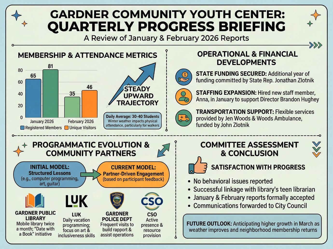 Public Welfare 4-3-26 Director Hugheyโs good news drew broad smiles from the Mayor and Councilor Brooks while Councilors Cormier and Hardern contained their excitement. Big news is that funding has been secured for a second year due to State Representative Jonathan Zlotnik securing a commitment from the state. Jen Woods and Wood Ambulance have provided flexible transportation for students and the bill was covered by Jonathan Zlotnik. Active membership has been growing from 65 registered members in January to 81 in February and an additional increase is expected in the March numbers. Unique visitors in January were 35 and 46 in February.