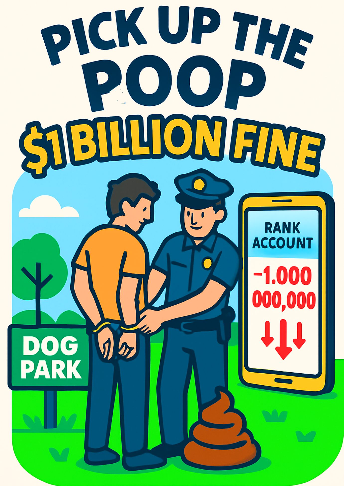 One lady posted: โI was at the park today and on the small dog side there was so many big dog poops! It was the worst that Iโve ever seen. This is why my dog hasnโt been there very oftenโฆโ Another stated: โWhen at the dog park, this is why there are bags to pick up after your dog takes a poo. Those of us who are responsible understand this and pick up after our pups. Personally, I always have bags on mydogs lead so I donโt leave the house without them. At the dog park there is also a rake and shovel to assist with pick up after your dog.โ I posted half in jest: โI donโt know if you have heard. But the fine for not picking up POOP at the Dog Park has been increased to 1 billion dollars.โ