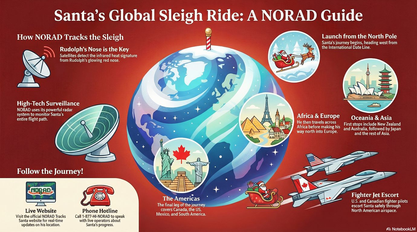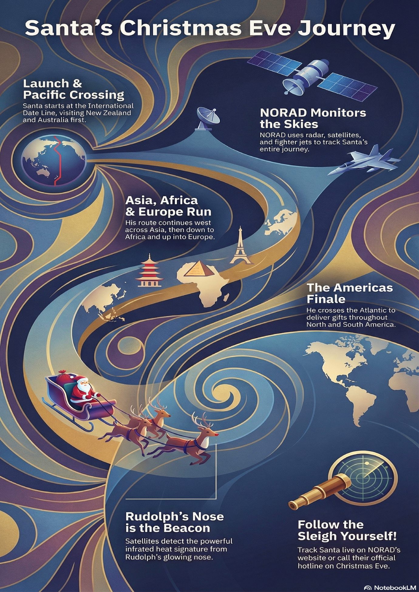 DEEP DIVE โ The Christmas Eve Global Journey of Santa Claus From Norad: Santaโs route from the North Pole starts at the International Date Line, traveling west across the Pacific to New Zealand, Australia, then Asia, Africa, Europe, and finally the Americas, following the night to deliver gifts, all tracked by NORAD using radar and Rudolphโs nose heat signature. Santa departs the North Pole on Christmas Eve, heading towards the International Date Line. Santa visits the South Pacific, then New Zealand and Australia, working his way west. Asia & Africa: Next, Santa travels over Japan, across Asia, and then to Africa. Europe: From Africa, he heads into Europe. The Americas: He crosses the Atlantic to Canada, the United States, Mexico, and Central & South America. NORAD: The North American Aerospace Defense Command tracks Santa using its powerful radar, satellites (detecting heat from Rudolphโs nose), and fighter jets.