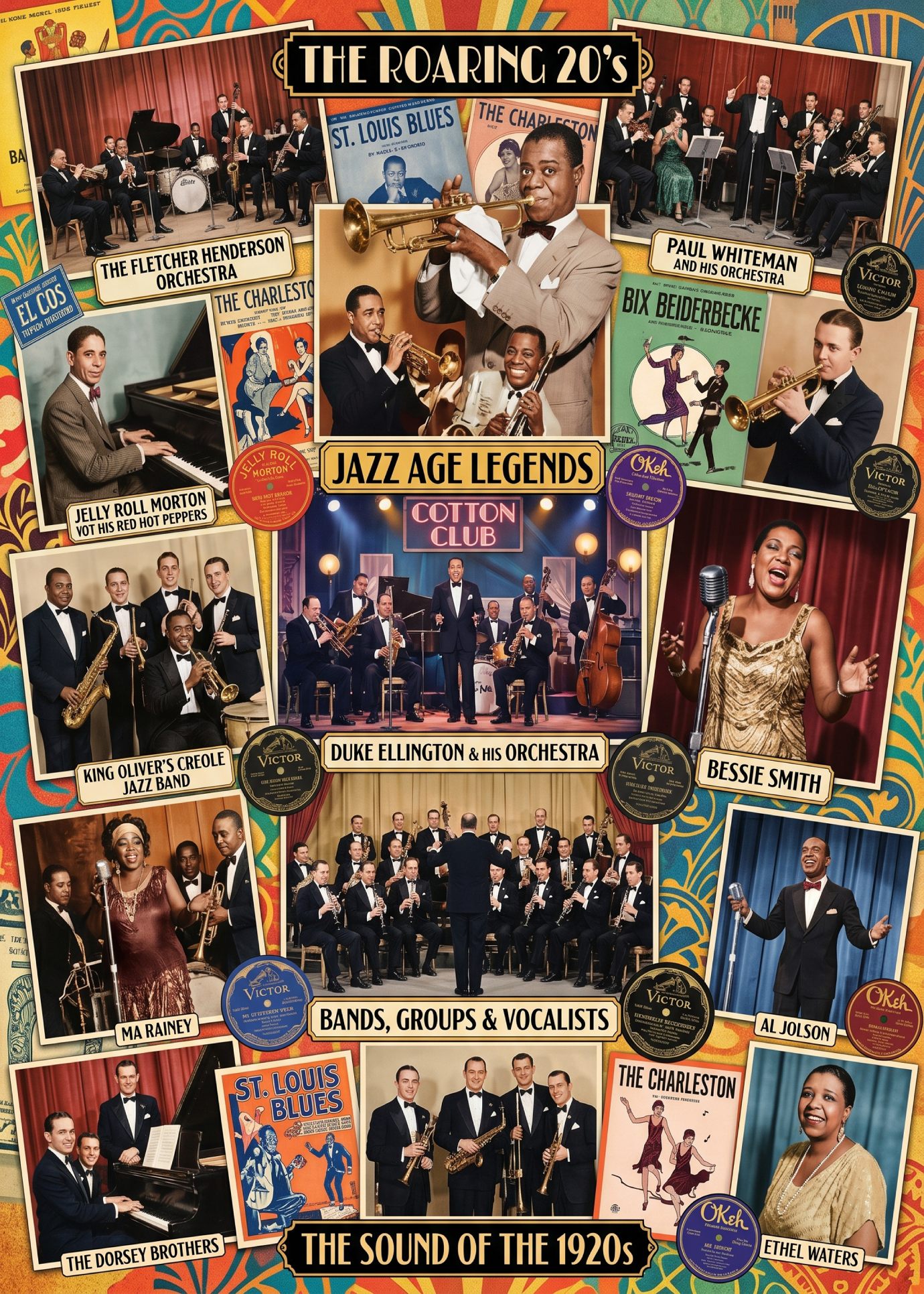 - Major Bands:ย King Oliver’s Creole Jazz Band, The California Ramblers, and the Fletcher Henderson Orchestra.