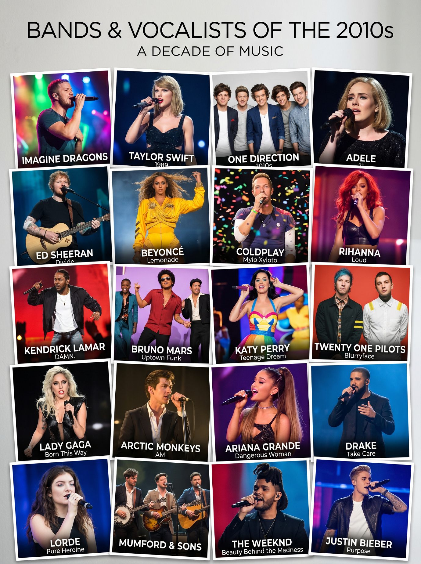 - 2010s Trends:ย Indie-folk (Mumford & Sons), dance-pop (The Chainsmokers), and the chart dominance of Adele, Taylor Swift, and Drake.
