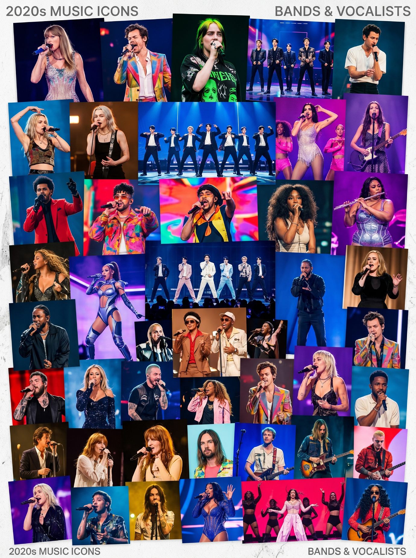 - 2020s Genre-Blending:ย Artists like Dua Lipa, Olivia Rodrigo, and Bad Bunny blend genres, while BTS represents the global dominance of K-Pop.