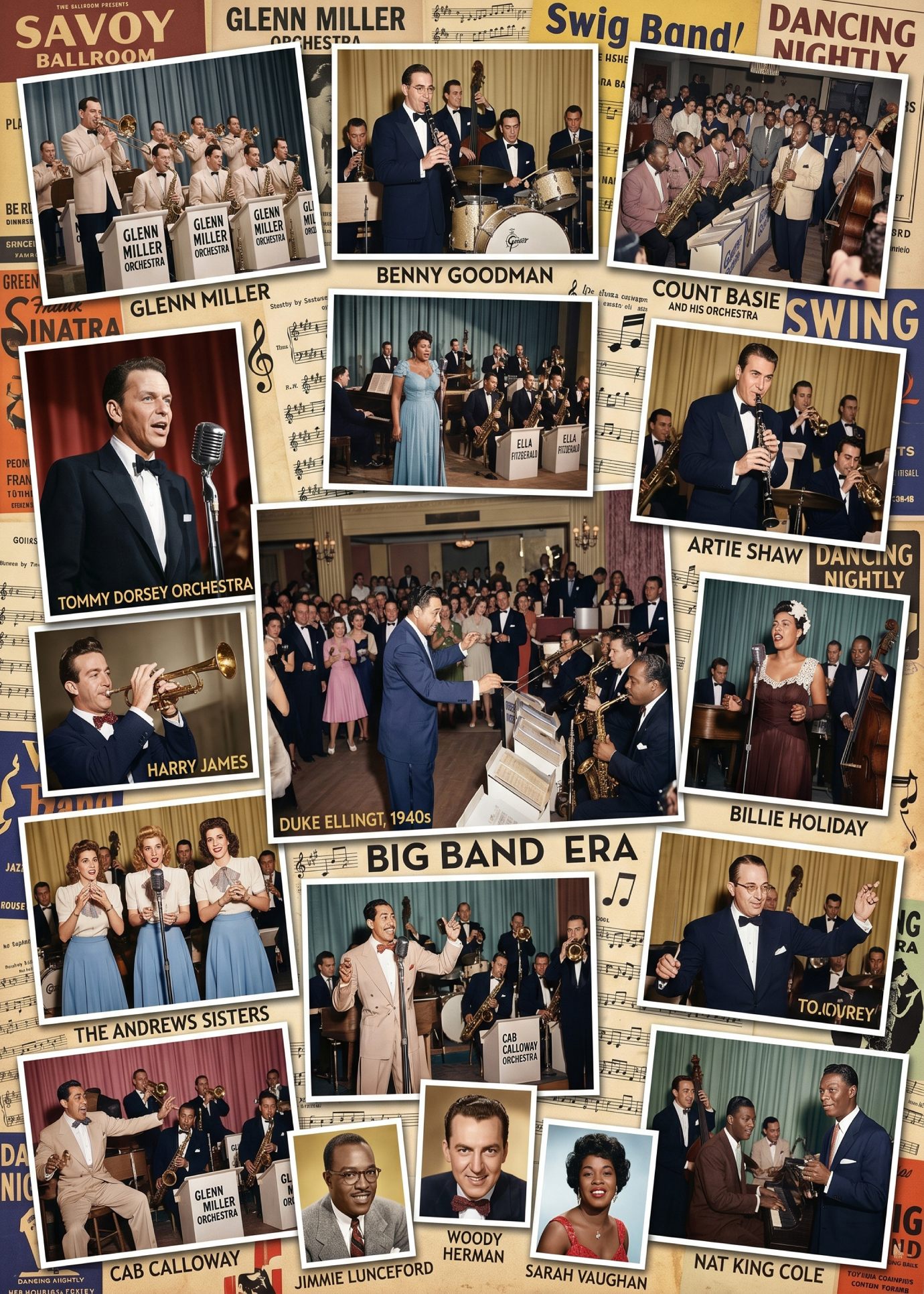 - Iconic Leaders:ย Benny Goodman (“The King of Swing”), Count Basie (Kansas City style), and Glenn Miller (commercial success).