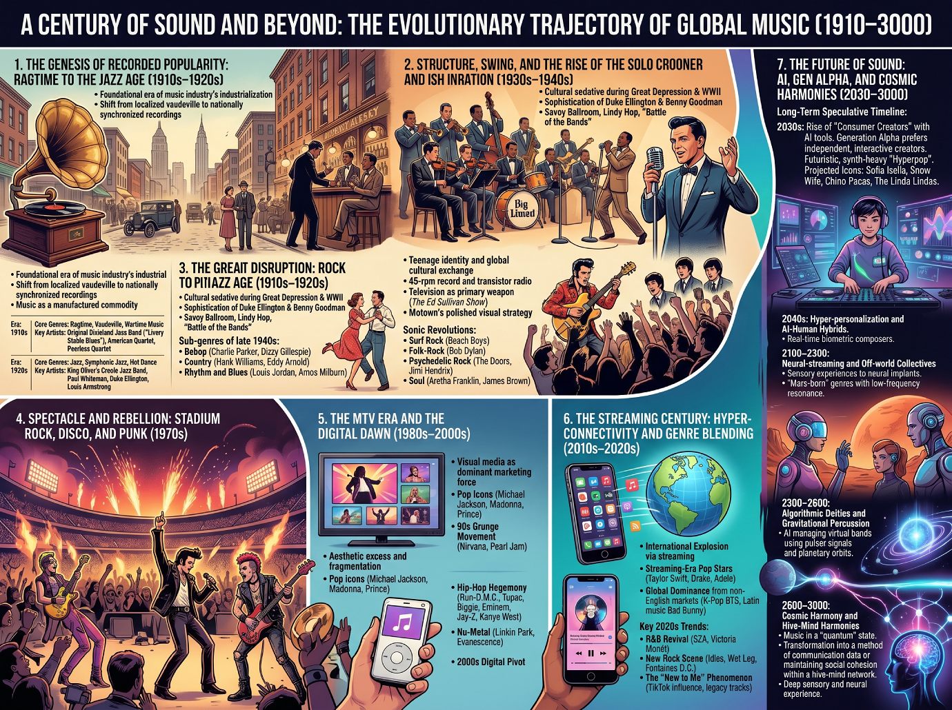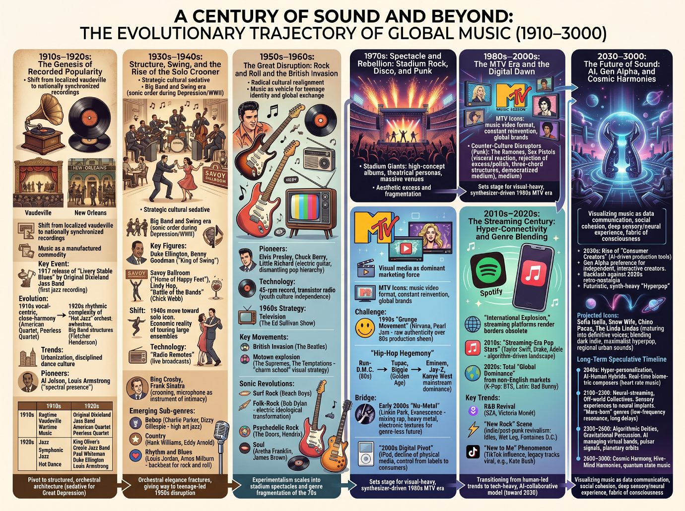 A Century of Musical Evolution and Future Projections (1910โ3000)