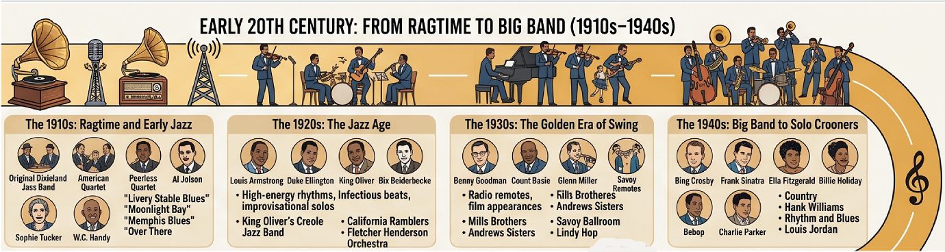 Early 20th Century: From Ragtime to Big Band (1910sโ1940s)