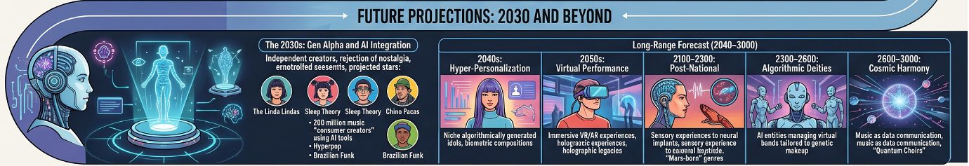 Projections for the 2030s and beyond suggest a radical shift toward AI-driven production, hyper-personalization, and eventually, bio-digital and “cosmic” harmonies that move beyond traditional human performance.