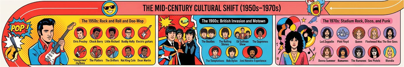 - The Mid-Century Revolution (1950sโ1970s):ย Saw the emergence of Rock and Roll as a “dangerous” teenage cultural force, the British Invasion, and the diversification into stadium rock, disco, and punk.