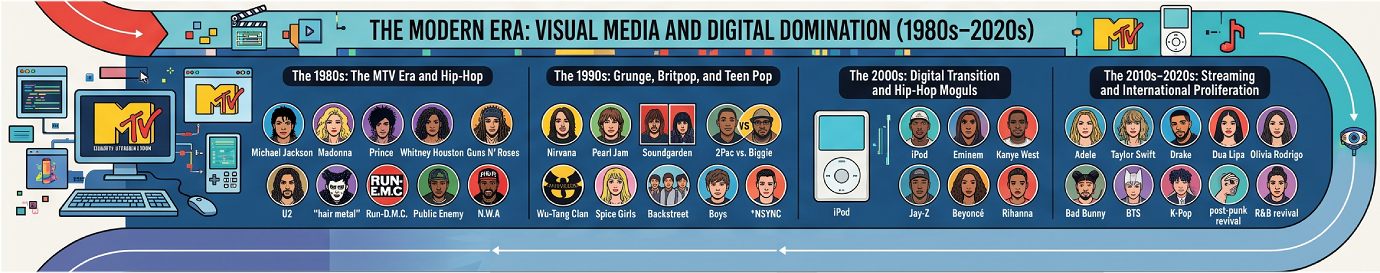 - The Modern Era (1980sโ2020s):ย Defined by the visual influence of MTV, the emergence of Hip-Hop as a dominant cultural force, the “Seattle Sound” (grunge), and the current landscape of international K-Pop and hyper-personalized streaming.