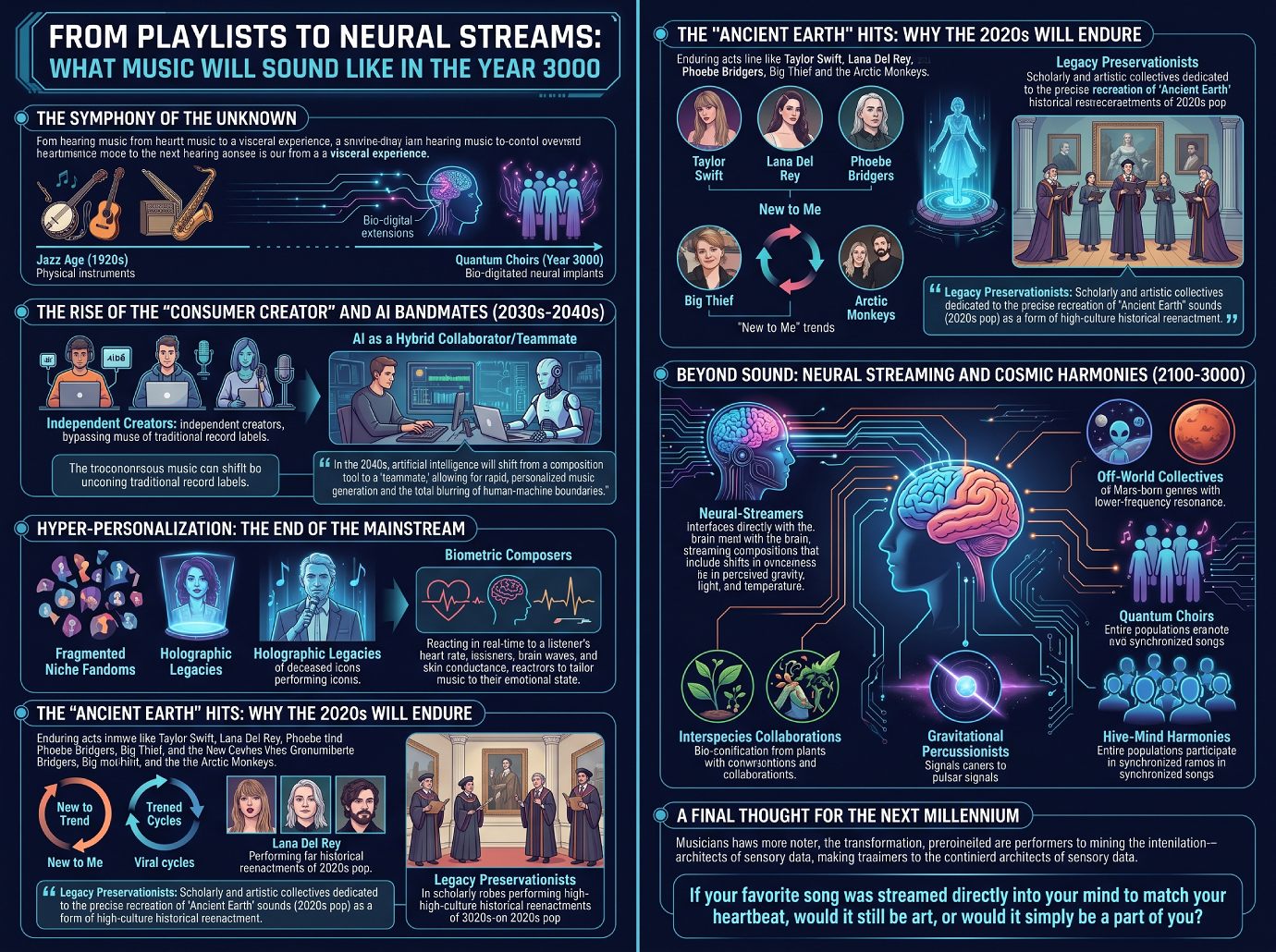 Over the next thousand years, the definition of a musician will complete its transformation from a performer with an instrument to an architect of sensory data. We are moving toward a future where music is not something we consume, but a fundamental layer of our biological and technological reality.