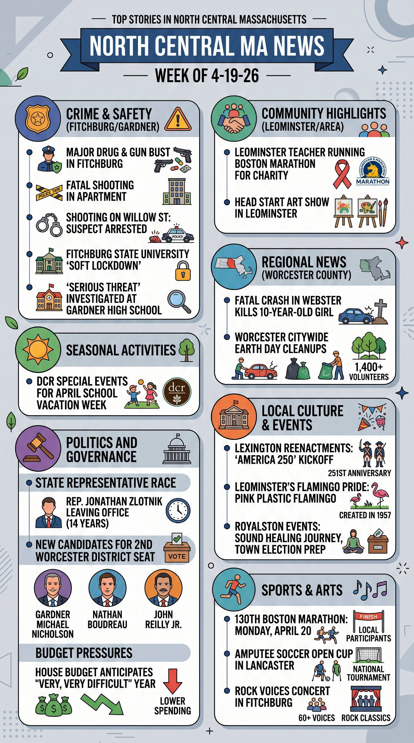 For the week of April 13, 2026, top stories in North Central Massachusetts include a deadly motorcycle crash in Lancaster, a dirt bike driver’s arrest for attacking a Fitchburg officer, and the ongoing, successful search for a missing monitor lizard in the region. Other key headlines include rising gasoline prices, local development concerns, and notable deaths within the community.