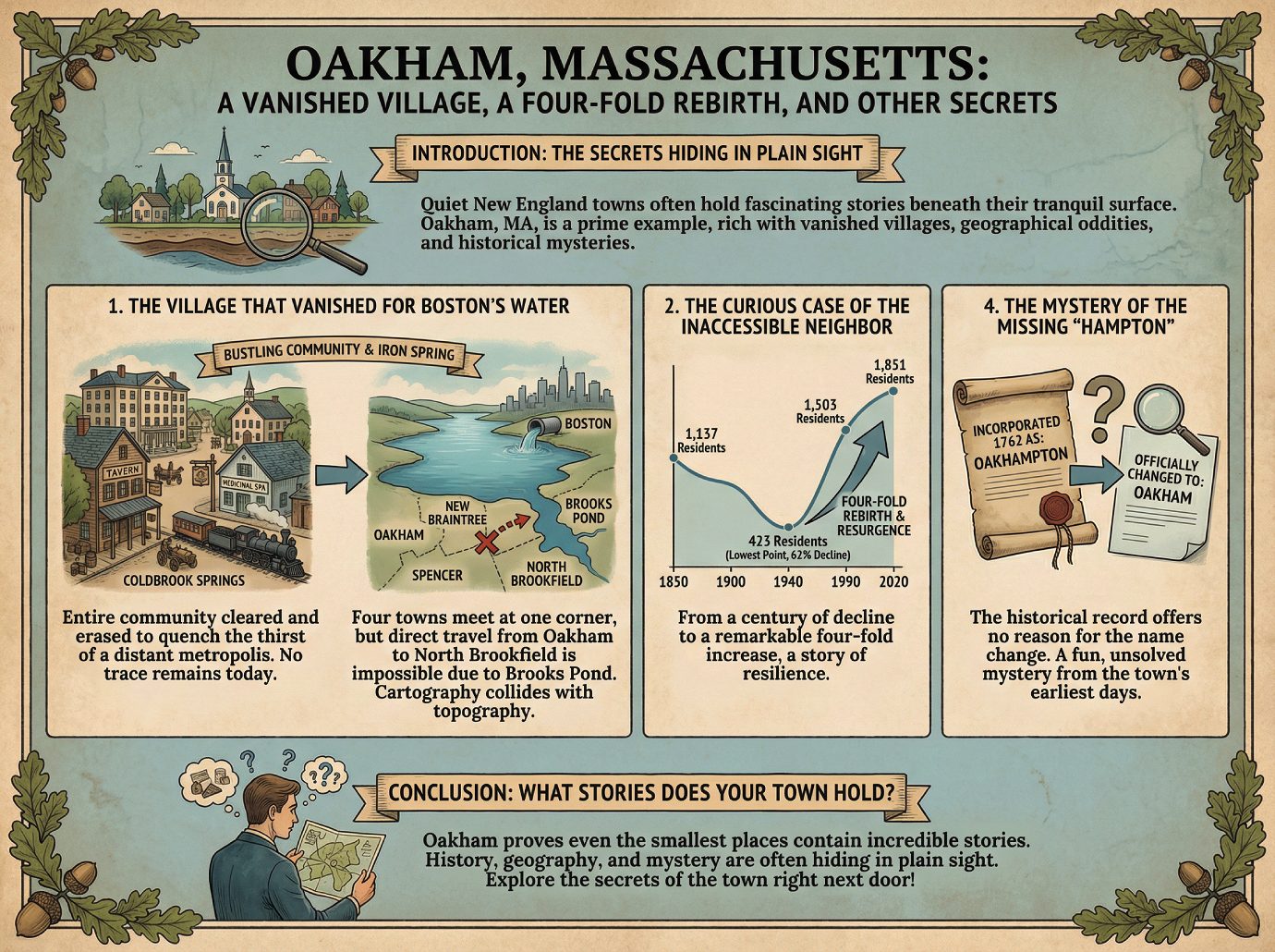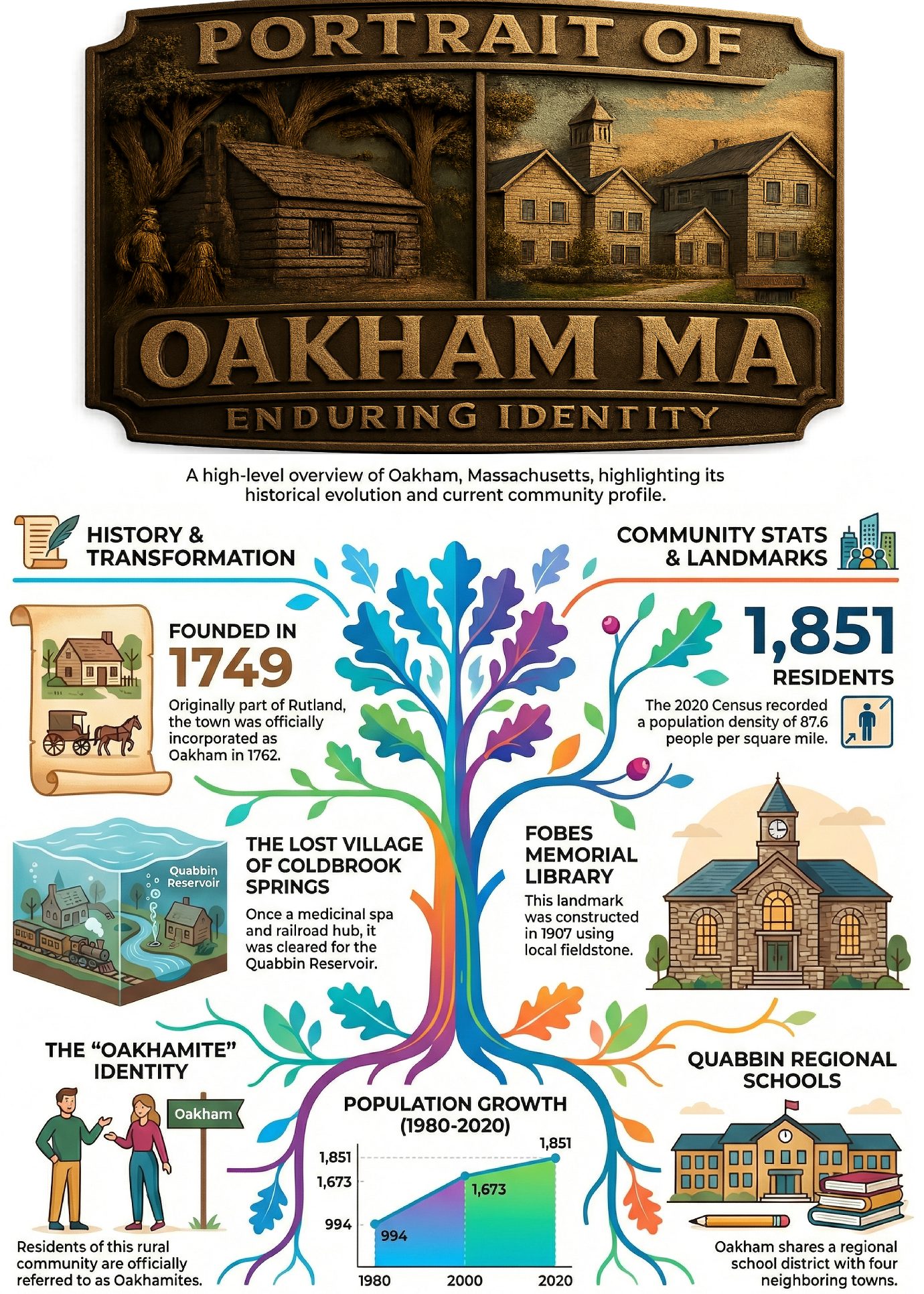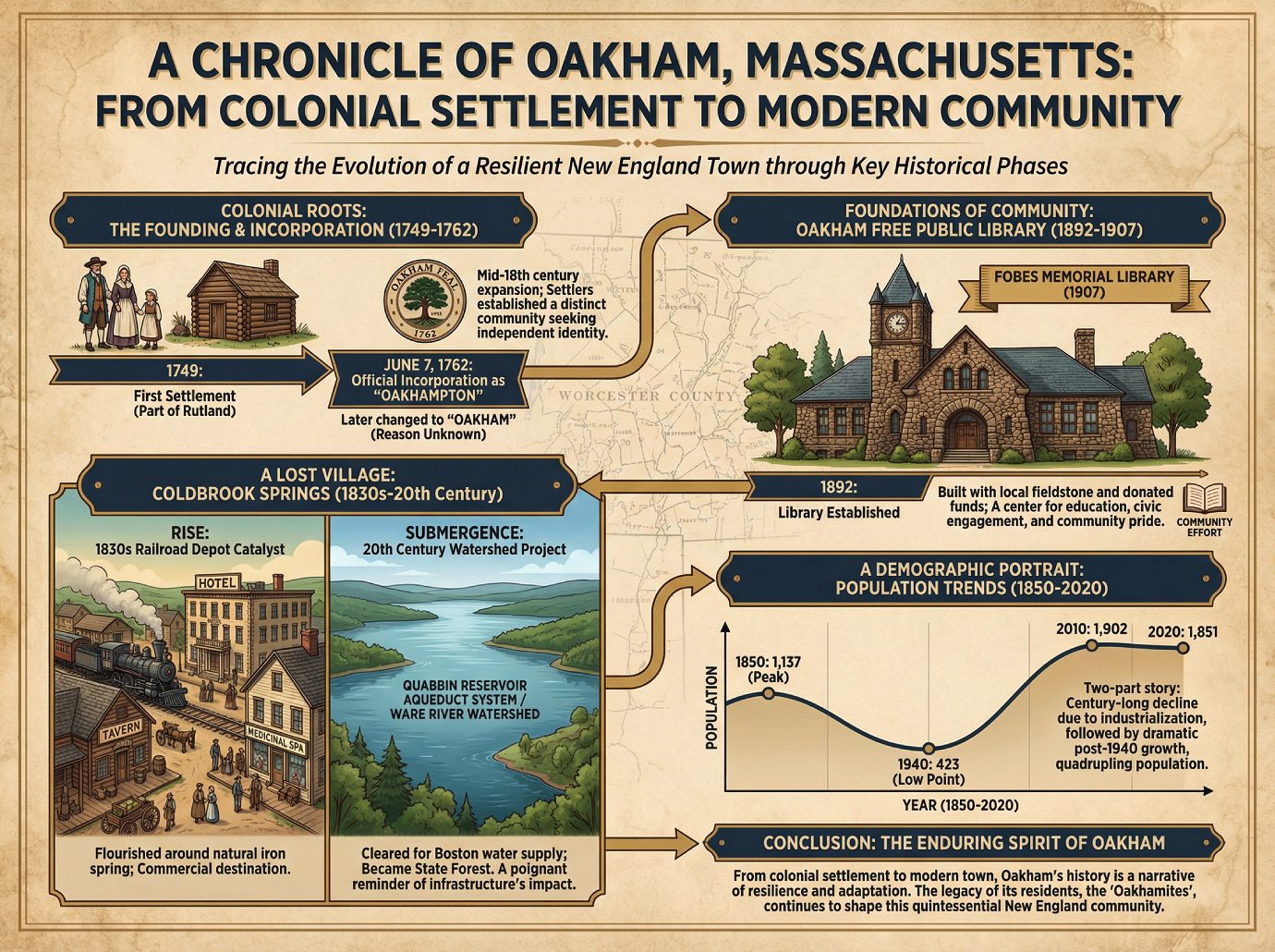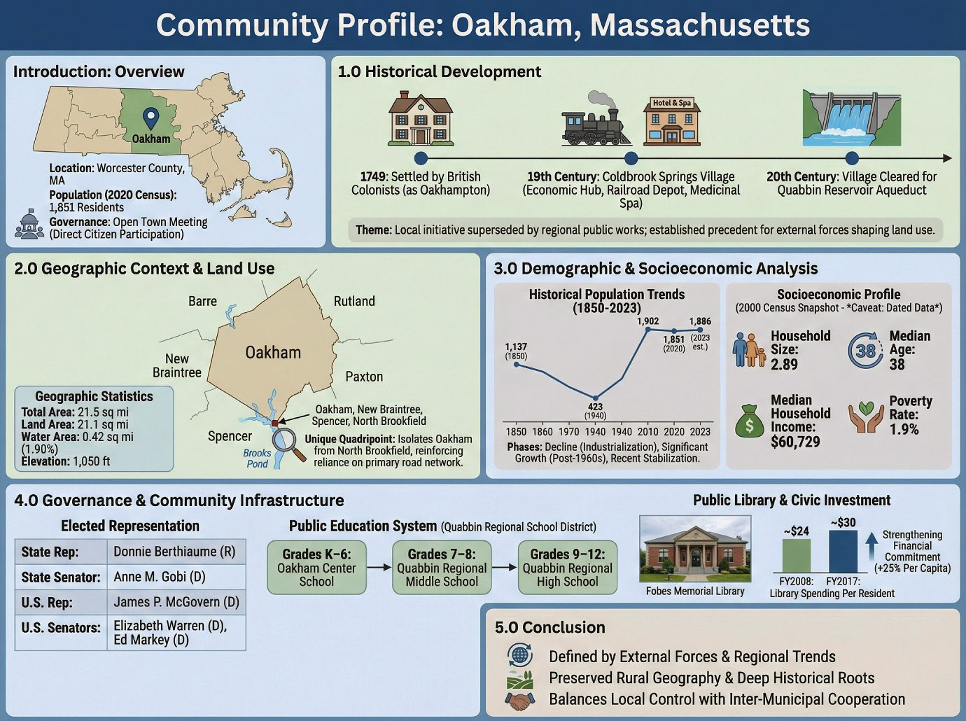 Oakham, Massachusetts, is a community whose development trajectory has been consistently defined by powerful external forces. From its colonial settlement and subsequent 19th-century depopulation driven by regional industrialization to the 20th-century erasure of a local village for a massive state water infrastructure project, the town’s story is one of adaptation to influences beyond its borders. This history has produced a community with deep historical roots, a distinctly rural and preserved geography, and a demographic profile that reversed a century of decline with robust late-20th-century growth.