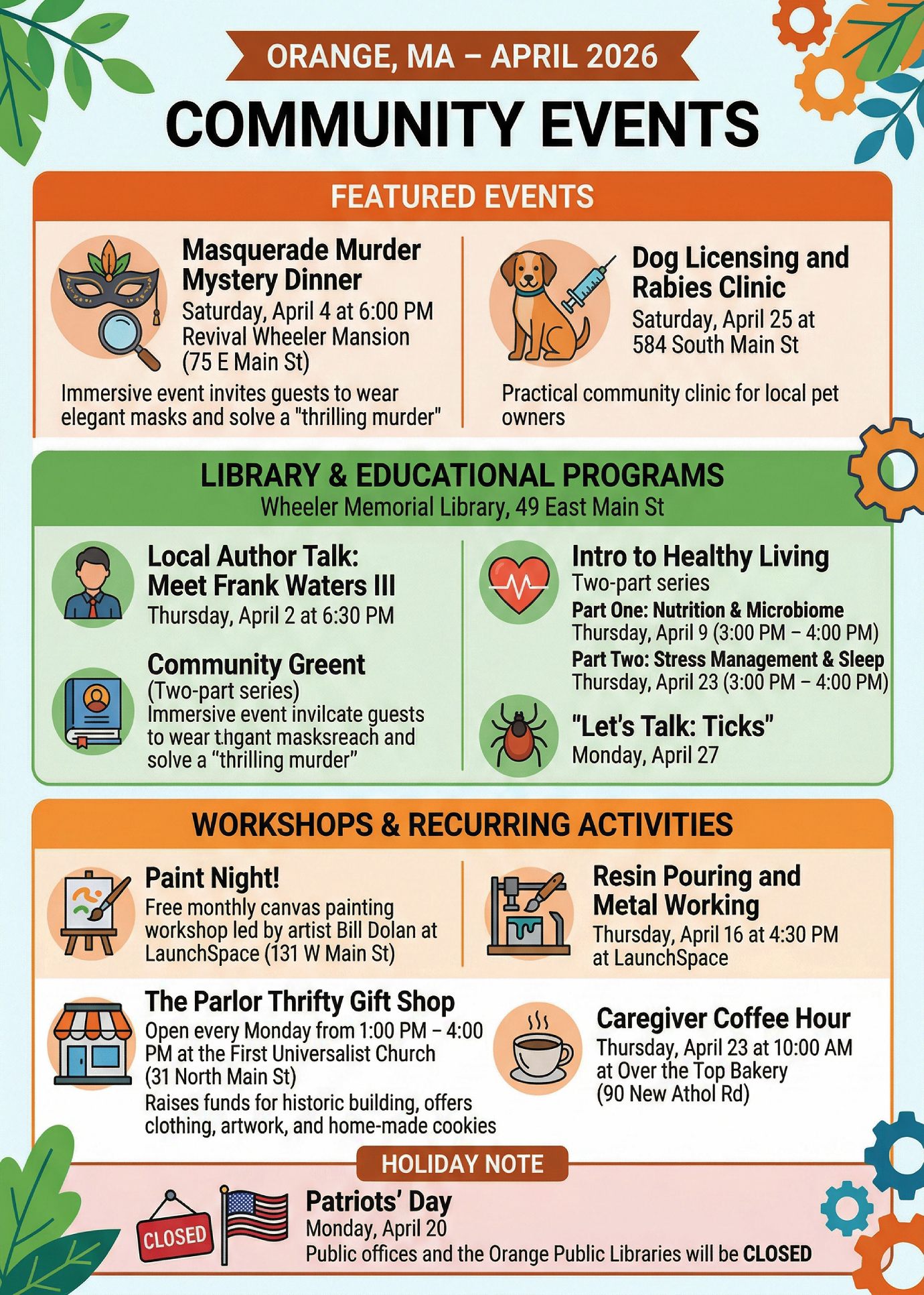 For April 2026, Orange, MA, has a variety of community activities ranging from a major mystery dinner to educational library programs and local craft workshops.