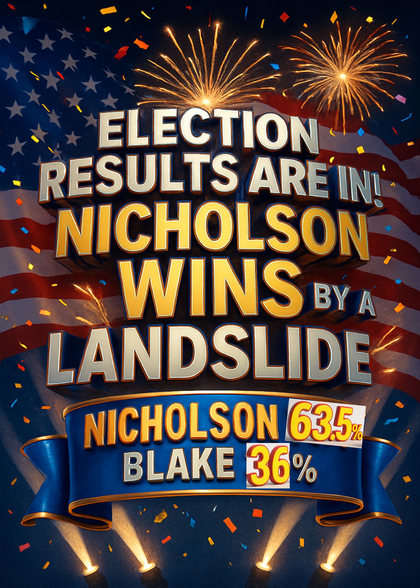 How does this compare to 2023? 2 years ago, it was in official results – Nicholson: 2,459 or 65.8%, Blake 1,189 or 31.8%, The difference this time was 52 less votes for Nicholson and 190 more votes for Blake. Voter turnout was slightly higher this time around. This year’s percentages will likely change slightly when official results are released.