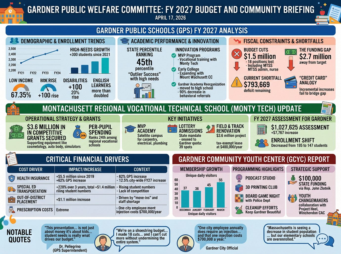 The Gardner Public Welfare Committee met on Friday, April17, 2026 and heard from various local officials regarding the fiscal year 2027 School Budget and other matters. Listen on any device, CLICK PLAY.