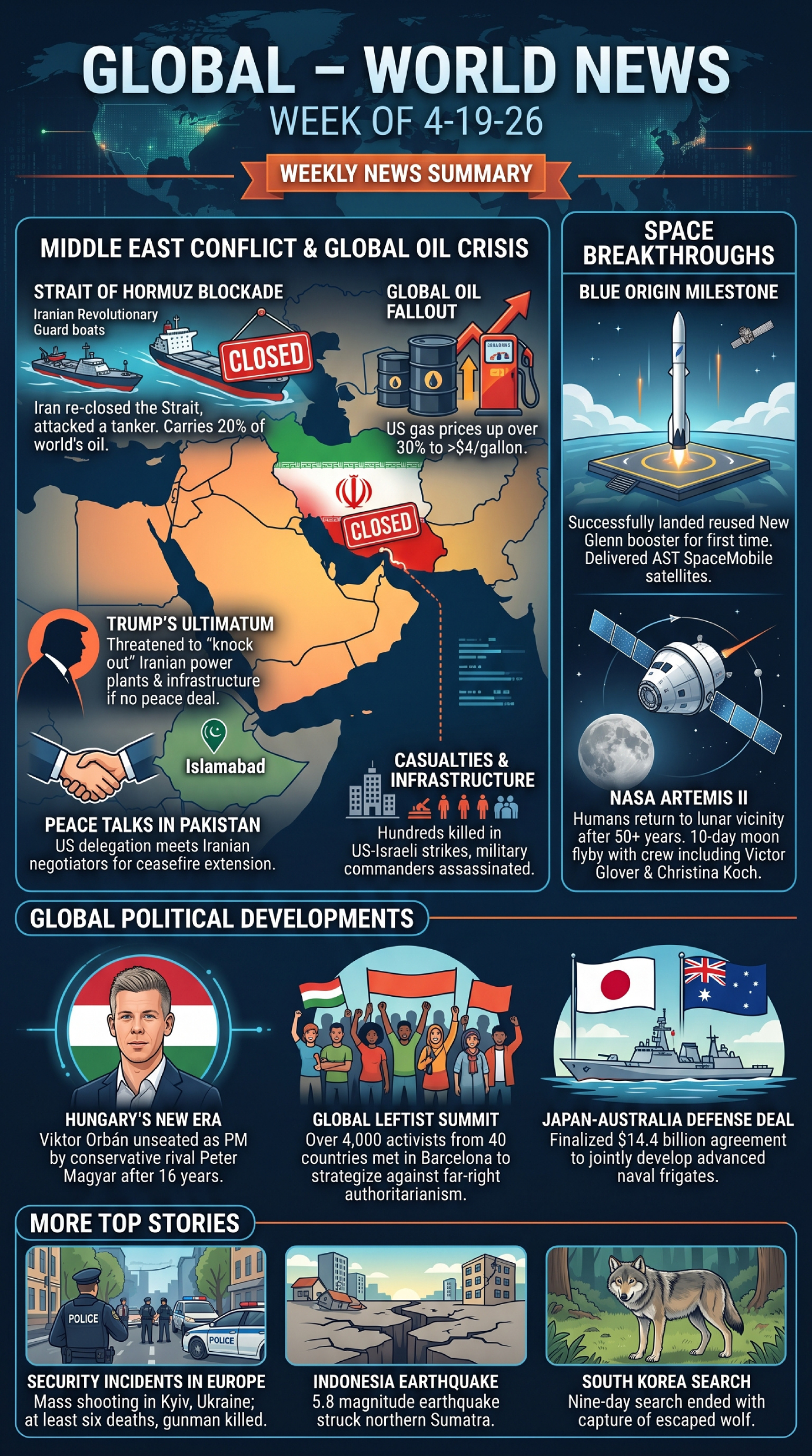 As of April 19, 2026, major global news is dominated by the escalating Iran-U.S. conflict, with Iran re-closing the Strait of Hormuz, prompting U.S. threats of military action against infrastructure while negotiations move to Pakistan. Other top stories include ongoing, fragile ceasefires in Lebanon, a mass shooting in Kyiv, and significant political shifts in Hungary.