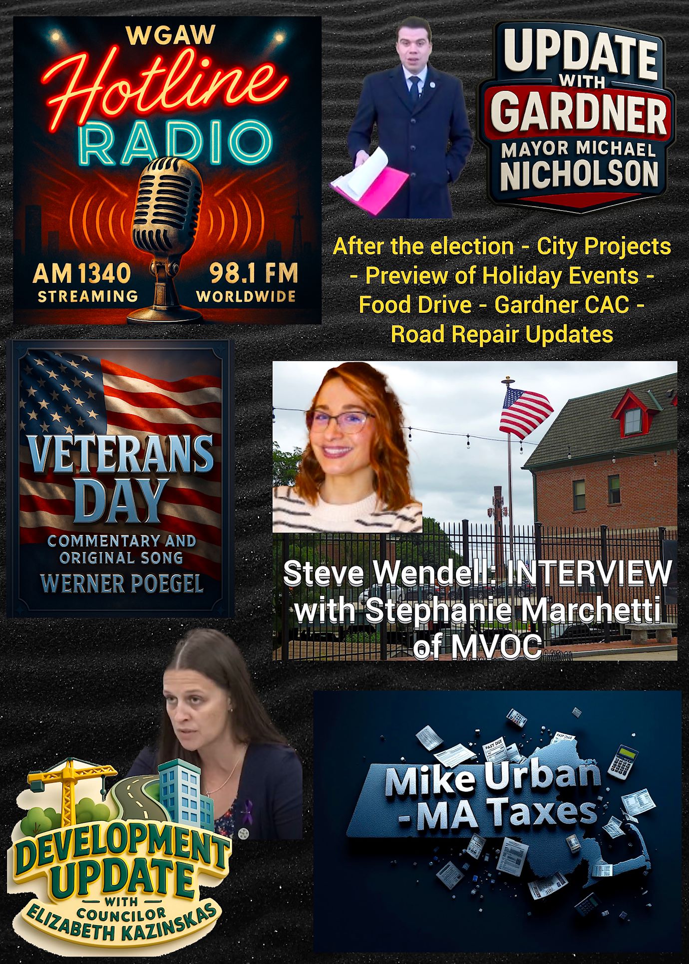 Steve Wendell urged people to go out and vote: The show paused as Wendell made his way to Studio B. —- Veterans Day and Original Song with Werner Poegel — 2nd Hour: Steve Wendell with an update on some local events going on. — Steve Wendell Interview with Stephanie Marchetti of the Montachusett Veterans Outreach Center (MVOC) – Marchetti spoke of various Veterans needs and issues. — Mike Urban and Massachusetts Taxes — Councilor Elizabeth Kazinskas with a comprehensive Development Update covering various City projects. — Nicholson Monthly Update