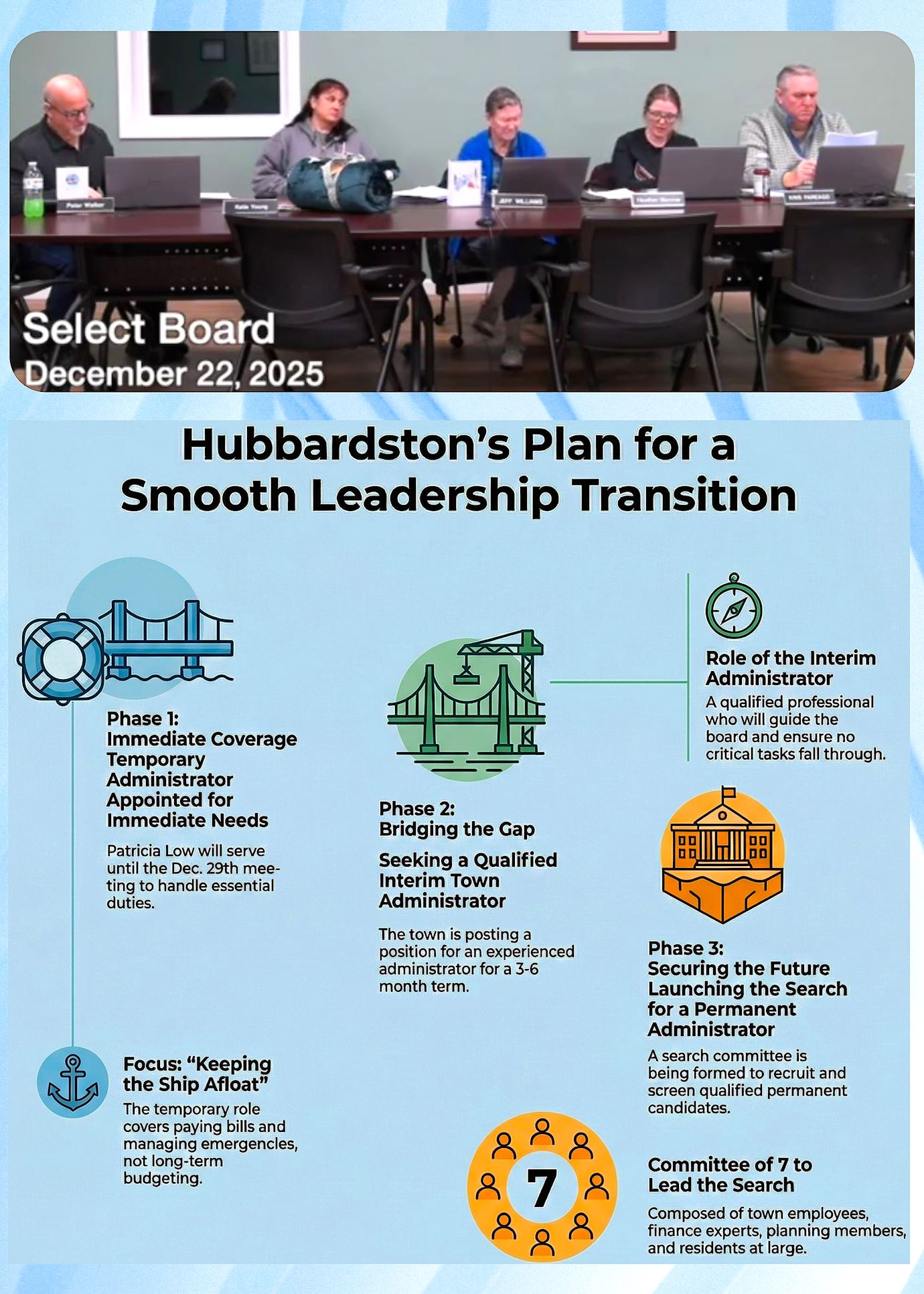 The Hubbardston Select Board held a meeting on December 22, 2025, to address critical personnel transitions and municipal management issues. Following the negotiated resignation of the Town Administrator to be effective December 26, 2025, the board discussed hiring an interim replacement and established a formal search committee to find a permanent successor. To maintain daily operations during the holidays, they appointed an existing staff member as a temporary administrator and updated several job descriptions to include accounting and billing responsibilities. Beyond staffing, members reviewed an electricity aggregation program aimed at lowering resident utility rates and addressed a tax billing oversight regarding a previously approved fire truck purchase. The meeting concluded with plans for professional accounting consultations to rectify discrepancies in the townโs financial records.