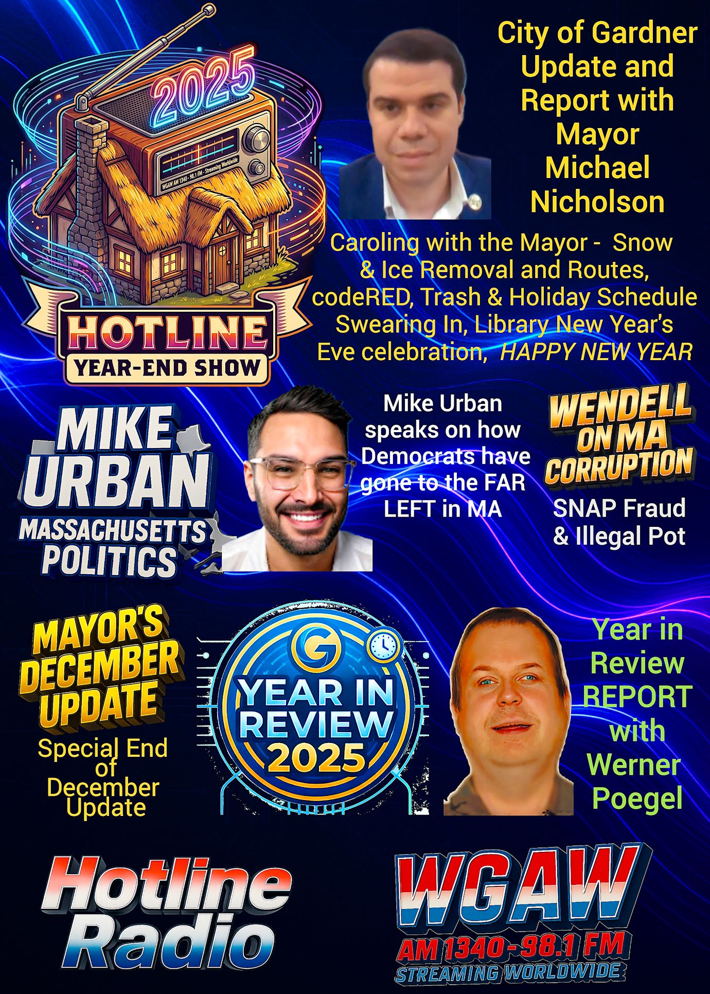 Hotline Radio 12-20-25 First up on Hotline Radio December 20, 2025: In last show before Christmas WGAW Hotline Radio features some Holiday Themes and Reflections Along with Gardner Updates. Gardner Mayor Michael Nicholson who affirmed that he is happy being Mayor and is not running for other offices including Lieutenant Governor (more made-up Facebook posts) Host Steve Wendell asked the Mayor about singing and Nicholson said he started back in High School when he was invited to join the choir. The Mayor subsequently was part of the Menโs Chorus at Umass Amherst. The Caroling with the Mayor event is coming up on December 22nd with FREE Horse-drawn carriage rides. As the Mayor put it, โa cheap date.โ