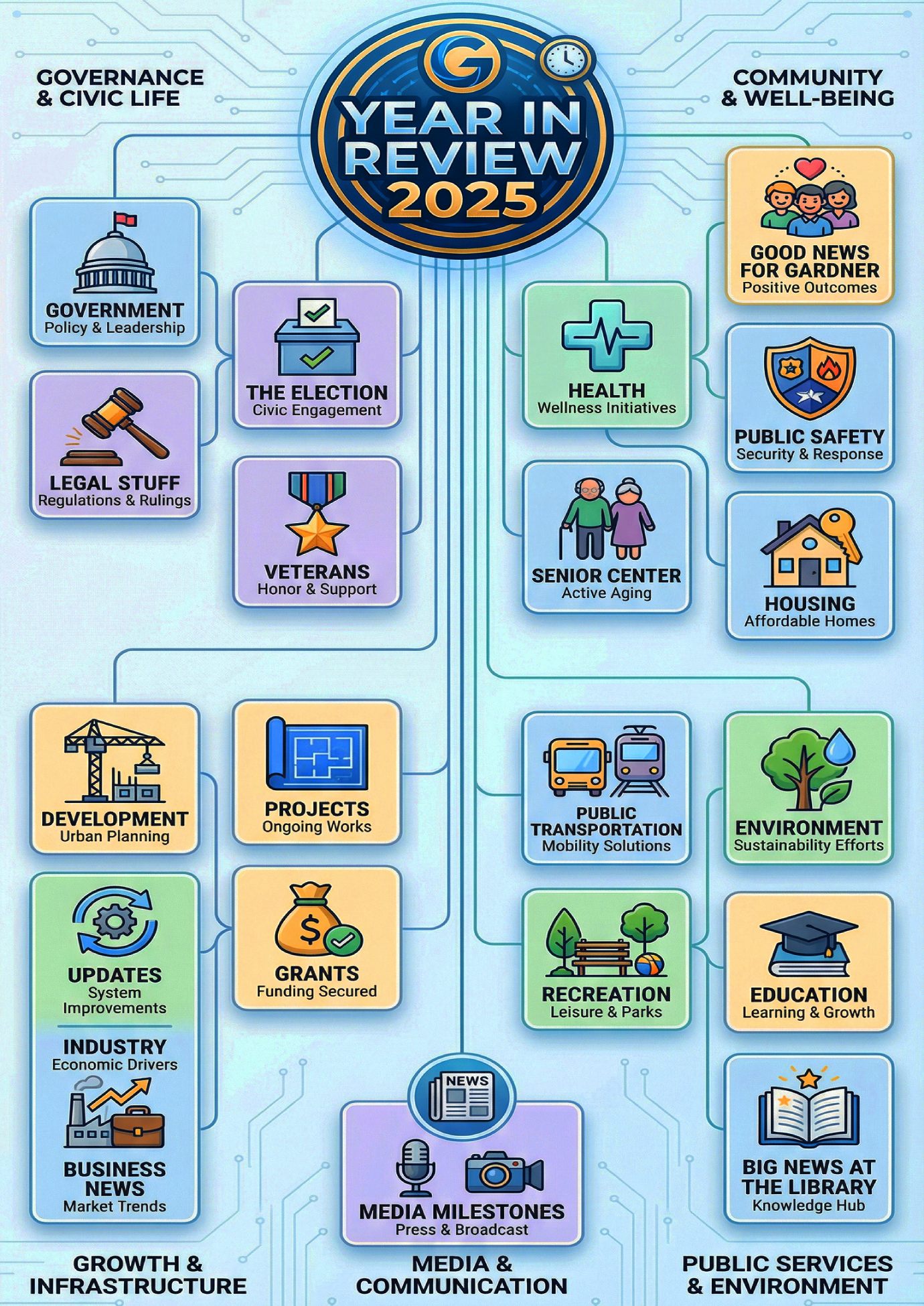 Report and Commentary โ Year and Review 2025 Categories covered: Government, Good News for Gardner, The Election, Development, Projects, Updates, Grants, Health, Public Safety, Public Transportation, Environment, Recreation, Education, Media Milestones, Big News at the Library, Business News, Senior Center, Industry, Housing, Veterans, Legal Stuff.