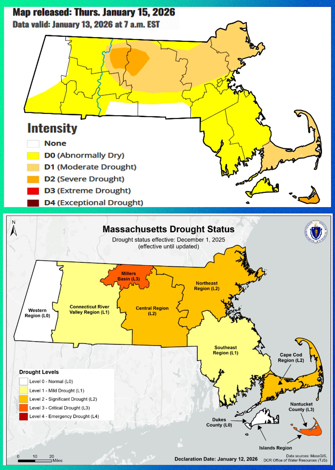DEEP DIVE โ 1-15-26 On January 12th, Massachusetts Energy and Environmental Affairs (EEA) Secretary Rebecca Tepper declared that the Central and Northeast Regions have worsened to a Level 2โSignificant Drought. Conditions also declined in nearly all other regions, moving the Southeast Region to a Levelโ1 Mild Drought and the Millers River Basin to a Level 3-Critical Drought. In the Islands Region, Dukes County has returned to Normal Conditions and Nantucket County has moved to a Level 3โCritical Drought. Conditions remain unchanged in the Western, Connecticut River Valley, and Cape Cod Regions.