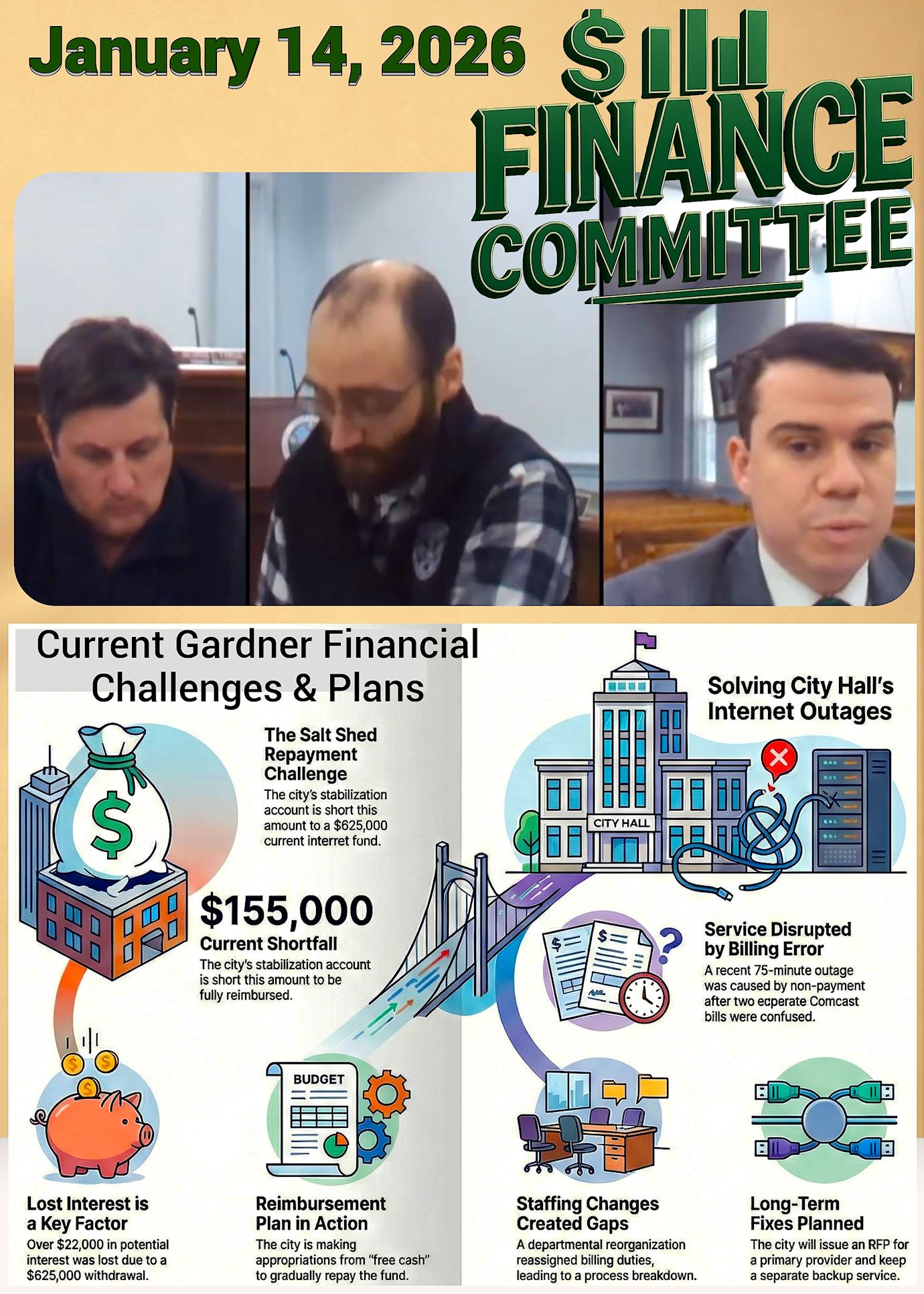 The Gardner Finance Committee met on January 14, 2026. Gardner Mayor Nicholson and Councilors Alek Dernalowicz and Council President George Tyros addressed several municipal fiscal and operational concerns.A significant portion of the discussion centered on the repayment plan for the Cityโs Salt Shed regarding the Mayorโs plan to reimburse the stabilization fund for principal and lost interest.