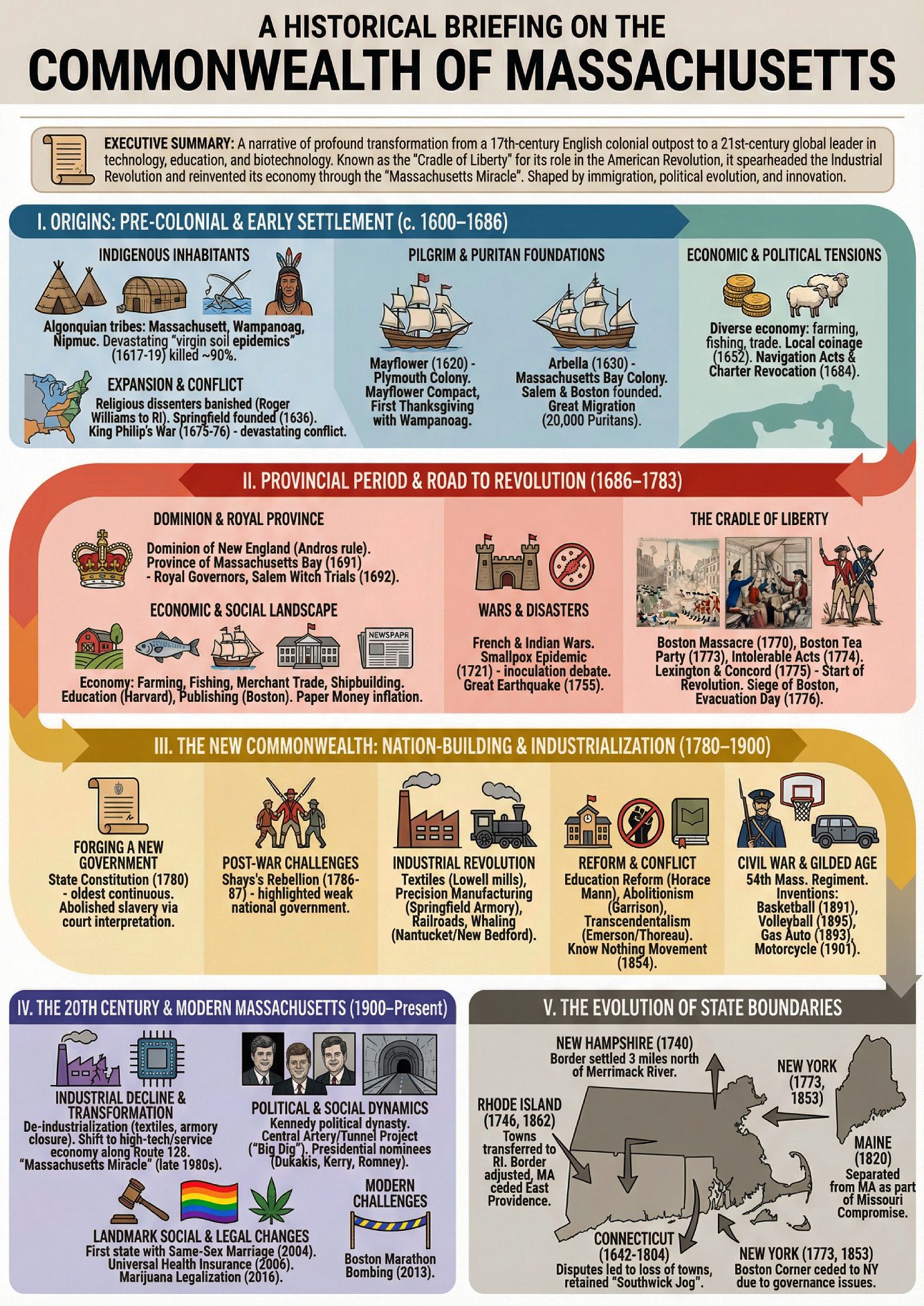 Infographics:ย Historical Briefingย โย Boundary Disputes, โย Beyond the Tea Party, 5 Surprising Truths That Redefine Massachusetts History,โThe Architects of Massachusetts: A Profile of Key Historical Figures, โย From Colony to Commonwealth โ The Story of Revolutionary Massachusetts