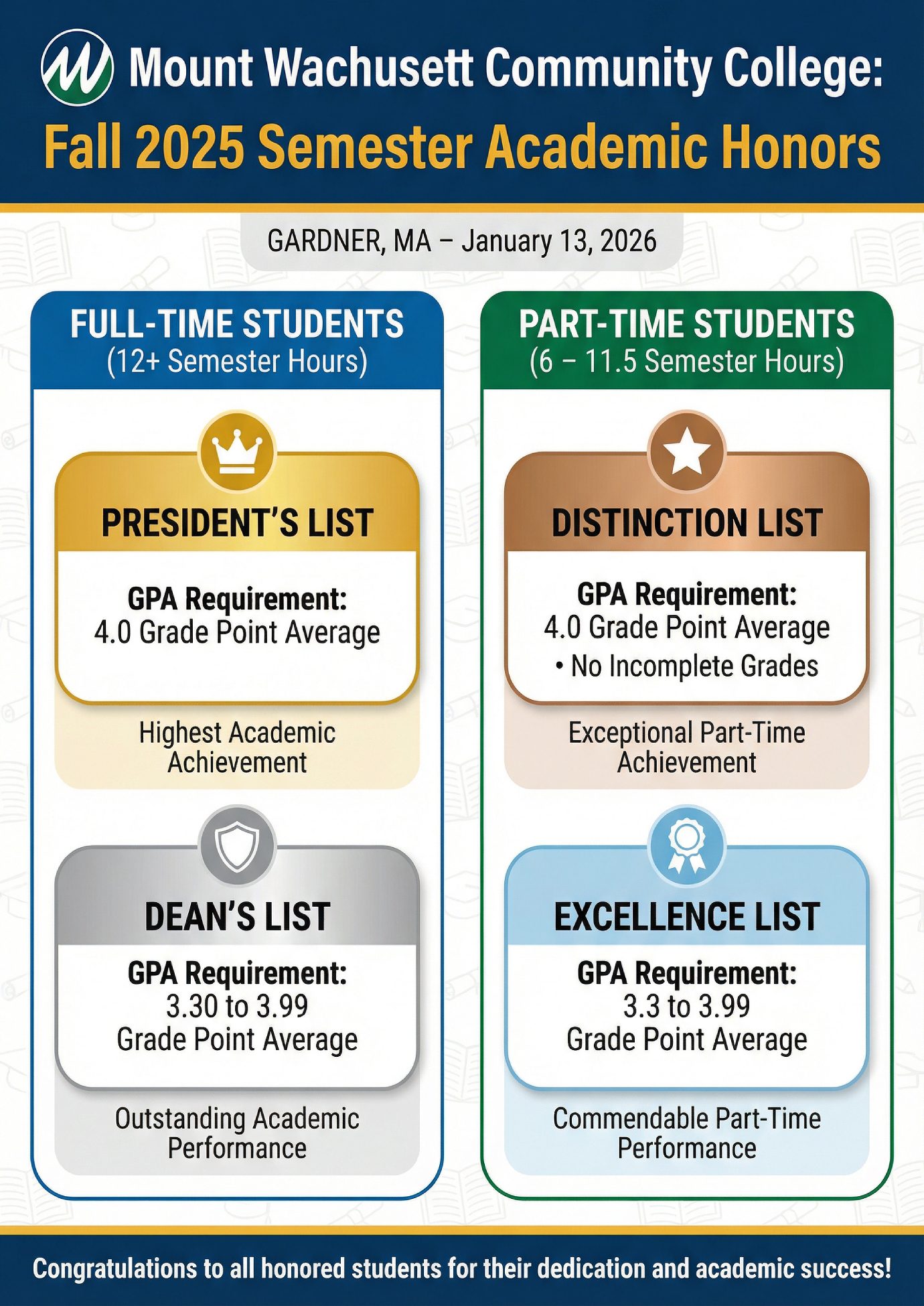 Mount Wachusett Community College Presidentโs, Deanโs, Distinction, and Excellence Lists