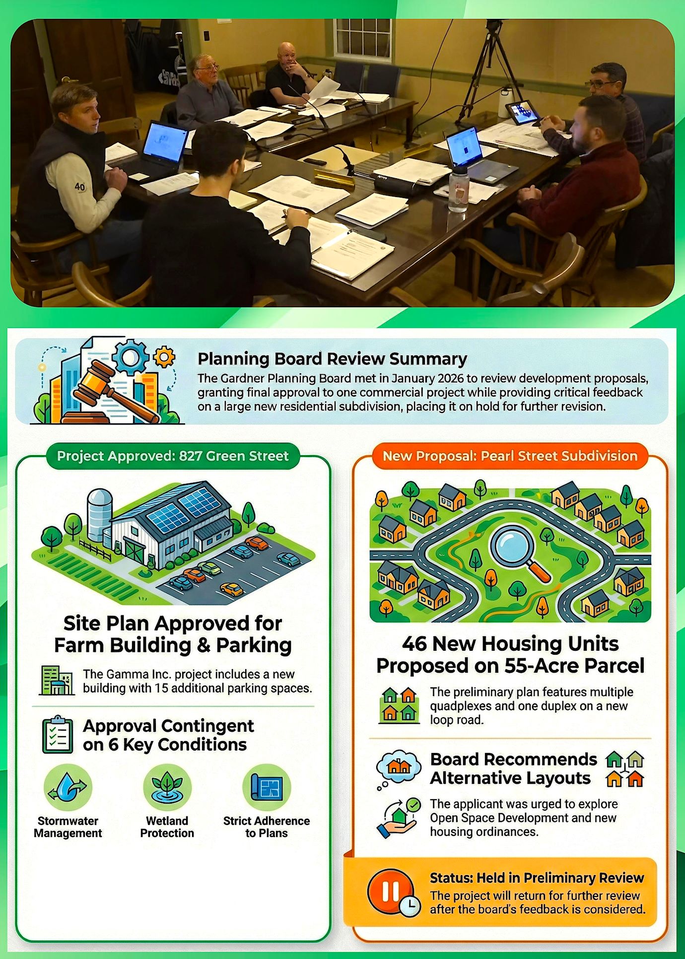 The Gardner Planning Board meeting of January 13, 2026 focused on three primary development projects, starting with the final approval of a site plan for 827 Green Street involving a new farm building and parking.The board then addressed a pond expansion project located in neighboring Hubbardston, ultimately deciding to draft a letter confirming their awareness of the proposal without offering a formal endorsement or objection.