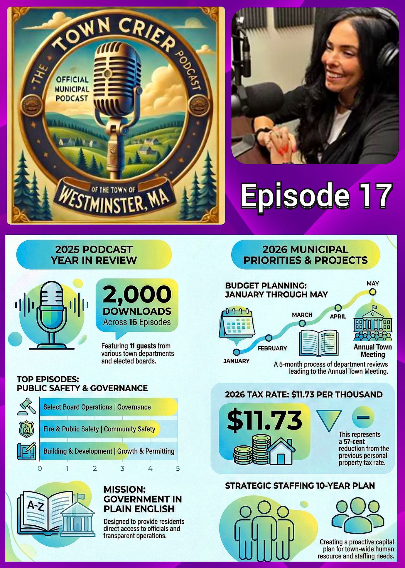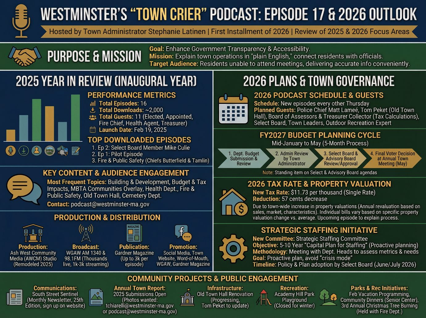 In this podcast episode, Town Administrator Stephanie Lahtinen launches the 2026 season of The Town Crier by reflecting on the programโs inaugural year and outlining future municipal goals for Westminster, Massachusetts. The podcast has been utilized to provide information on local government operations for residents, while previewing critical upcoming milestones such as the Fiscal Year 2027 Budget Planning and the Annual Town Meeting. Significant updates include a reduction in the property tax rate and the formation of a Strategic Staffinc Committee and ongoing renovations at the Old Town Hall. Lahtinen also invites community participation through photo submissions and listener feedback for the Town Crier to guide future topics. Listen to Episode 17 on any device, CLICK PLAY.Town Crier Episode 17 โ Westminster MA While there have been a total of 2000 downloads to the episodes through the town website, there have been tens of thousands of downloads through Gardner Magazine and thousands of LIVE listeners each episode through WGAWโs Hotline Radio Show and 1000 to 3000 additional listeners per episode by those who listen to the Hotline livestream after the program airs.